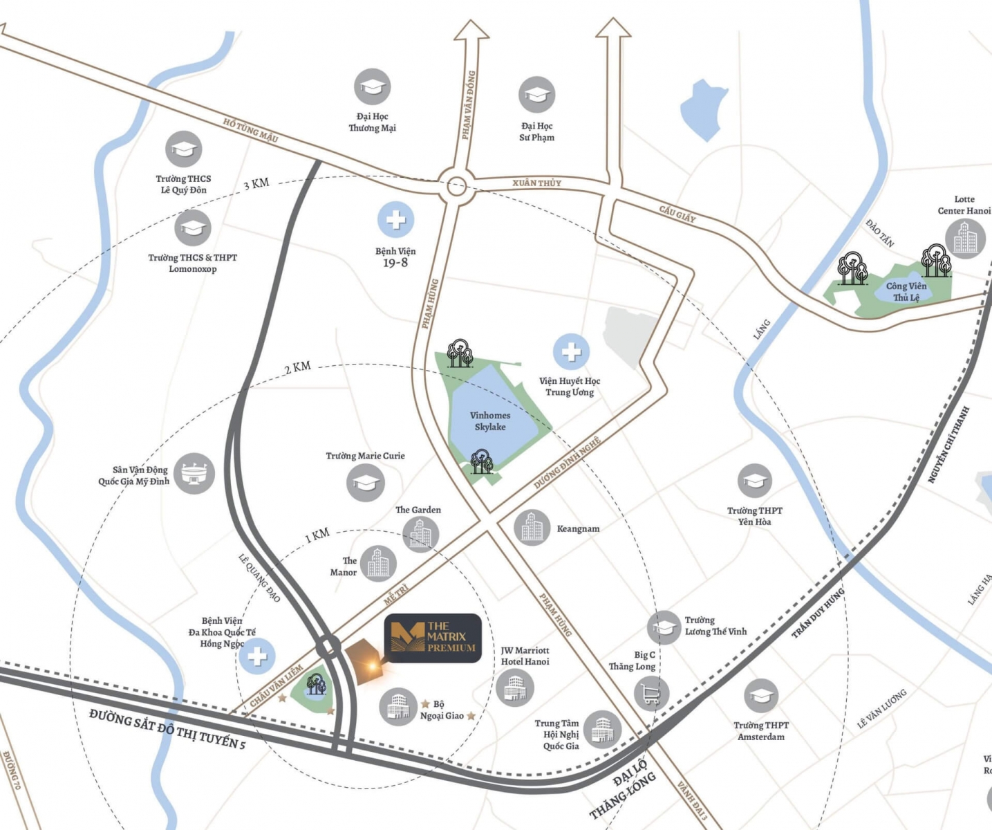 • Đây cũng là trung tâm hành chính – kinh tế, thể thao giải trí mới của Hà Nội với hàng loạt các bộ ngành quan trọng, Trung tâm Hội nghị Quốc gia, Sân vận động Quốc gia Mỹ Đình… nên mức độ an toàn và chất lượng dân sinh vượt trội. Bao quanh dự án là các tiện ích dịch vụ phong phú, hấp dẫn và tiện lợi cho cư dân, trong đó không thể không kể đến hệ thống các trường giáo dục hàng đầu và danh tiếng như: Trường liên cấp Amsterdam, Marie Curie, Lomonoxop, ĐH Quốc gia Hà Nội. Hệ thống trung tâm thương mại đẳng cấp như: TTTM The Garden, Vincom Center. Dự án The Matrix Premium cũng tiệm cận các bệnh viện hiện đại đầu ngành của cả nước như: Bệnh viện 19-8, Bệnh viện huyết học TW, Bệnh viện An Sinh (Hồng Ngọc).