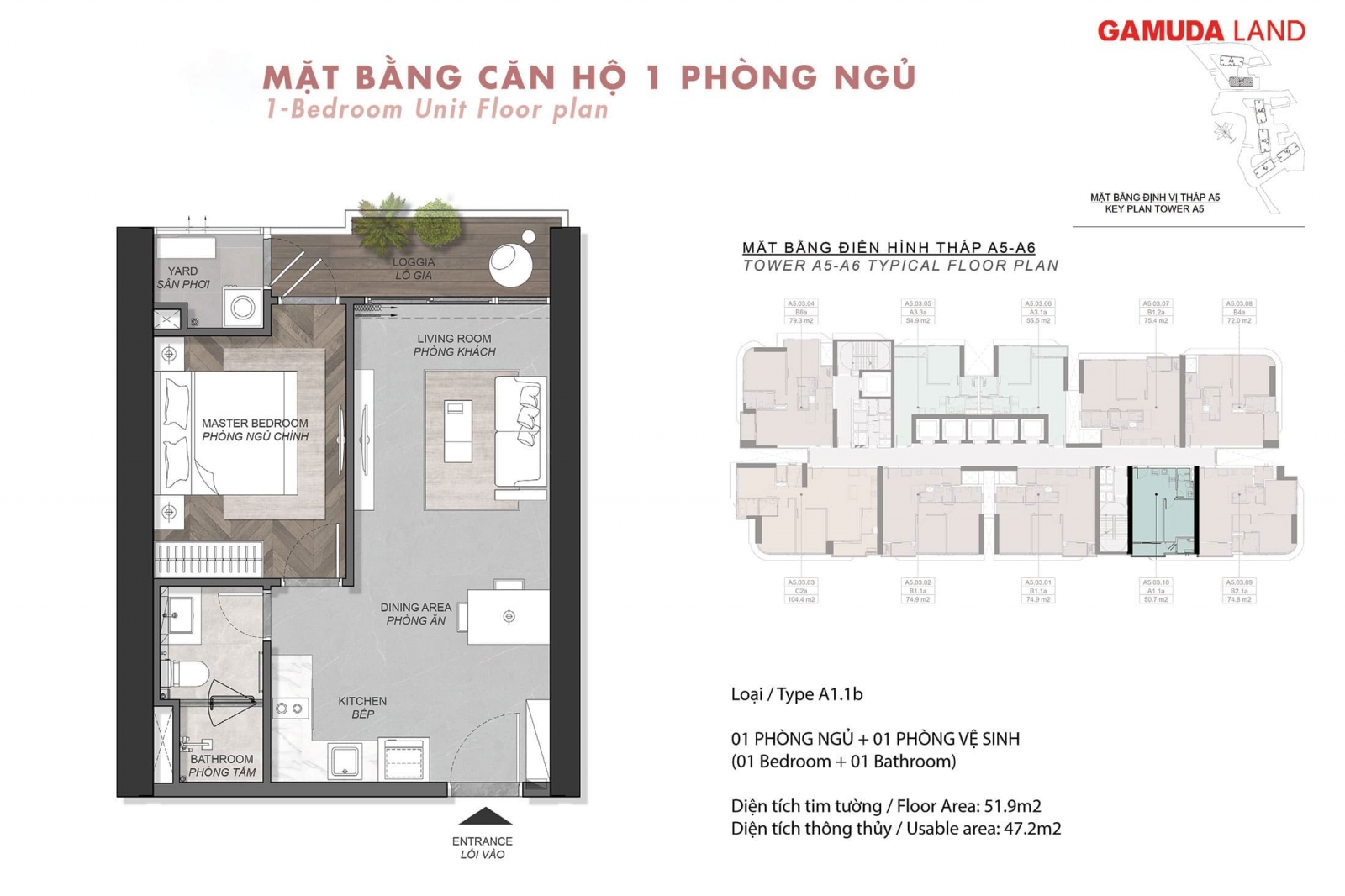 - Căn 1PN: 50.7m2 – 59.5m2.