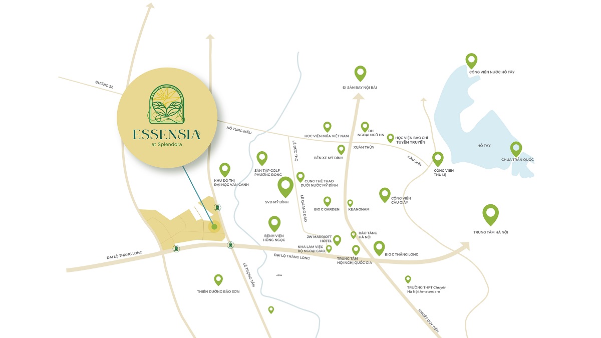 • Toạ lạc ngay đầu Đại Lộ Thăng Long, vị trí cửa ngõ kết nối Khu Mỹ Đình - Trái tim kinh tế mới của thủ đô Hà Nội, Essensia tại Splendora được hưởng đặc quyền “không tắc đường” hiếm có nhờ sự quy hoạch thông thoáng và bài bản. Trong tương lai gần, Splendora và Essensia càng kết nối dễ dàng hơn nhờ sự phát triển hiện đại hơn của hệ thống đường vành đai 3.5, đường sắt đô thị và các khu đô thị vệ tinh lân cận…