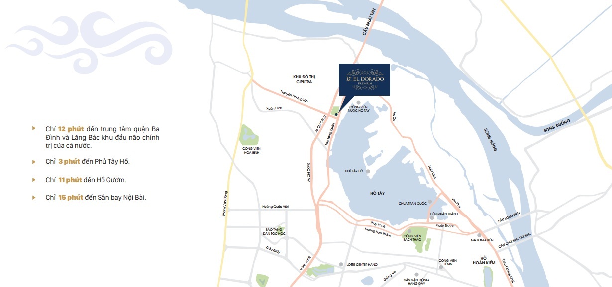 • Tái hiện lại truyền thuyết trên, Dự án D’.EL DORADO với thiết kế tinh xảo, các chi tiết phù điêu mạ vàng ròng hoành tráng và lấp lánh soi bóng bên Hồ Tây phía trước là quảng trường đường Lạc Long Quân và Nguyễn Hoàng Tôn.