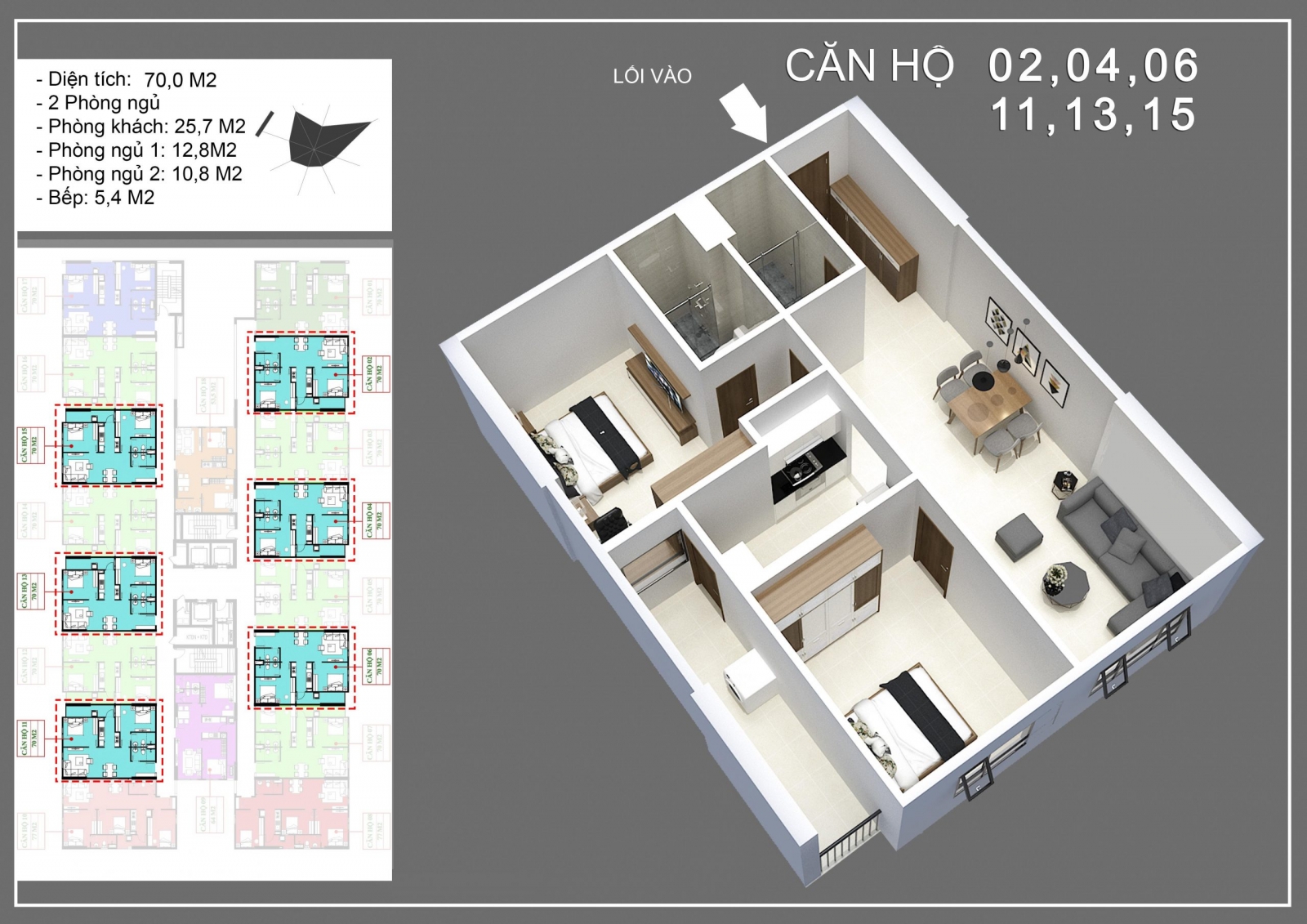 • Diện tích căn hộ: 53,5m2 - 64m2 - 70m2 - 77m2.