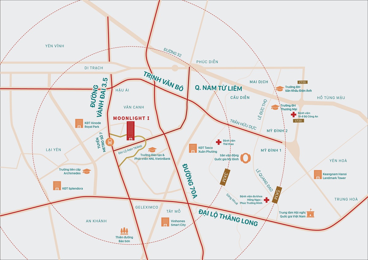 • Tòa căn hộ cao cấp Moonlight I tọa lạc tại vị trí tâm điểm phát triển phía Tây Thủ Đô, thuộc địa phận Vân Canh, Hoài Đức. Đây được coi là vị trí lõi kết nối trực tiếp tới trung tâm thủ đô bằng cả đường nội thị Trịnh Văn Bô và đại lộ Thăng Long. Ngoài ra, dự án còn là tâm điểm kết nối các trục đại lộ huyết mạch như: đường nối đường Phạm Hùng (vành đai 3) với vành đai 3.5 huyện Hoài Đức, đường 70A nối từ Nhổn tới Đại lộ Thăng Long, tuyến Metro số 7 chạy qua khu đô thị.