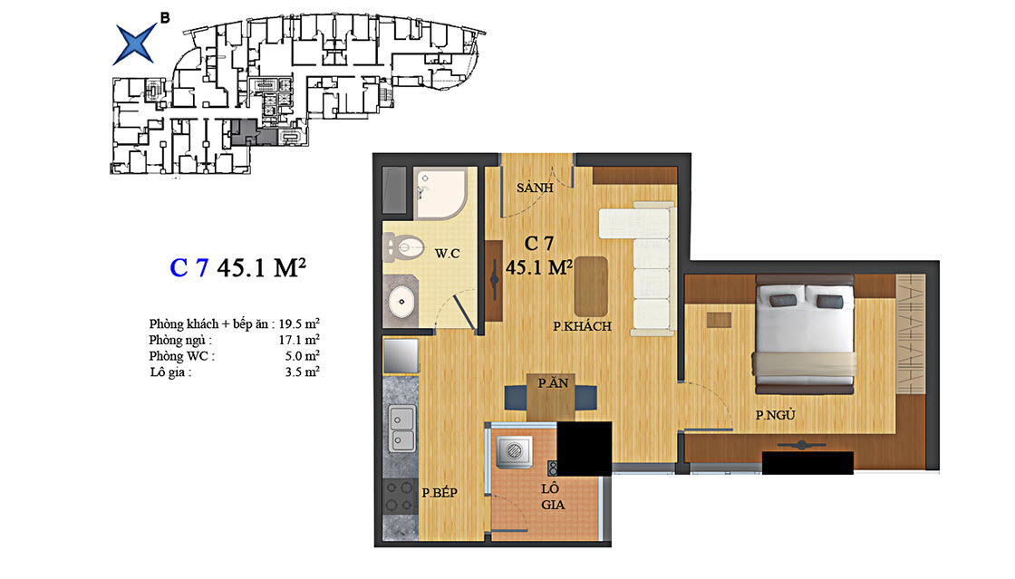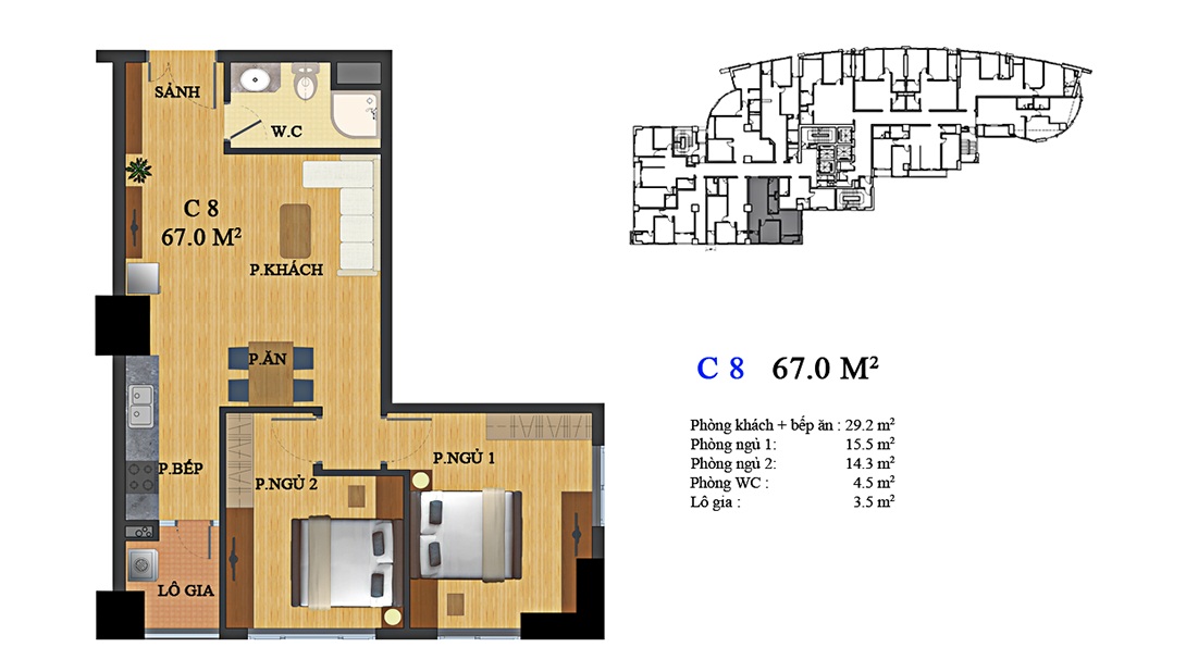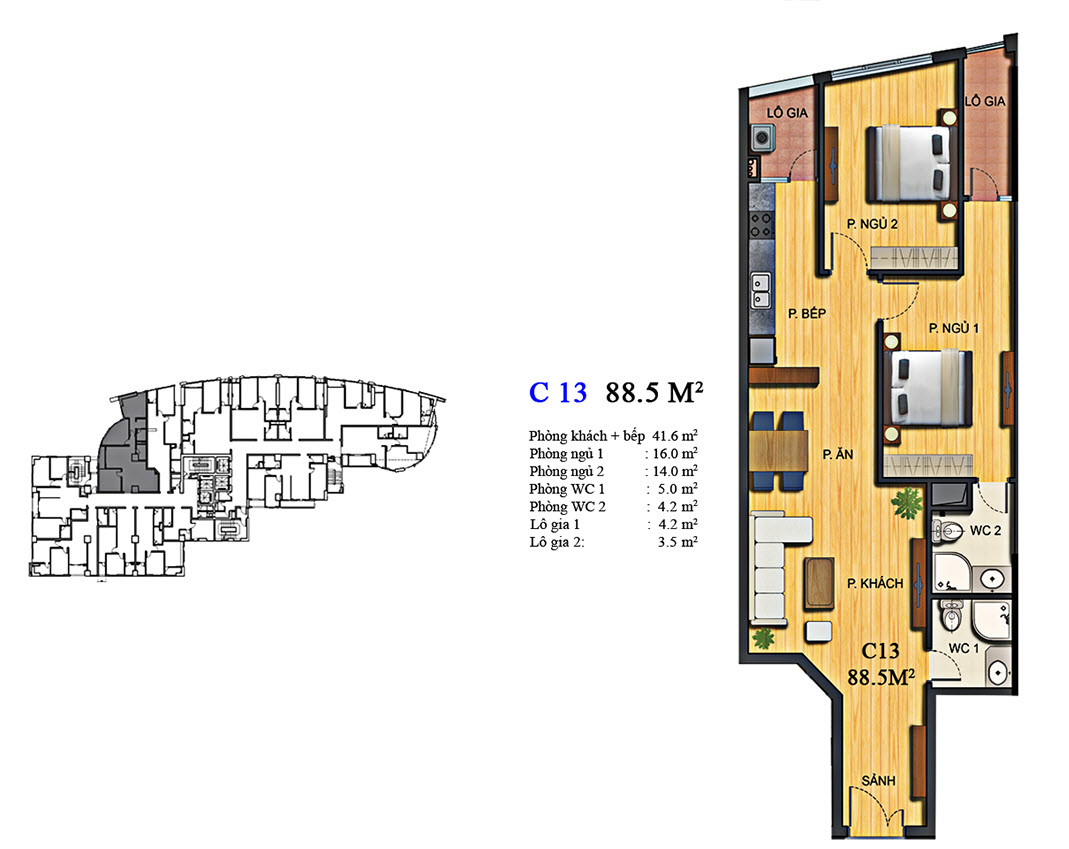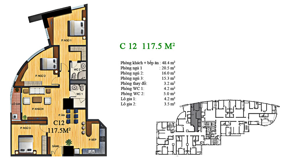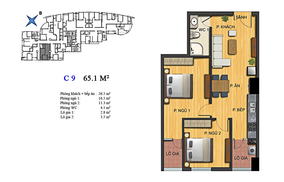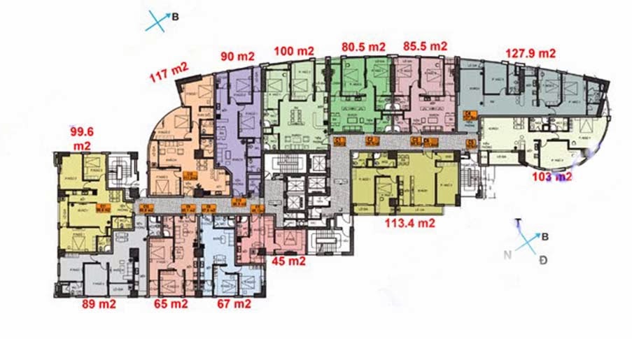 • Diện tích các căn hộ để ở: từ 45m2 đến 128m2