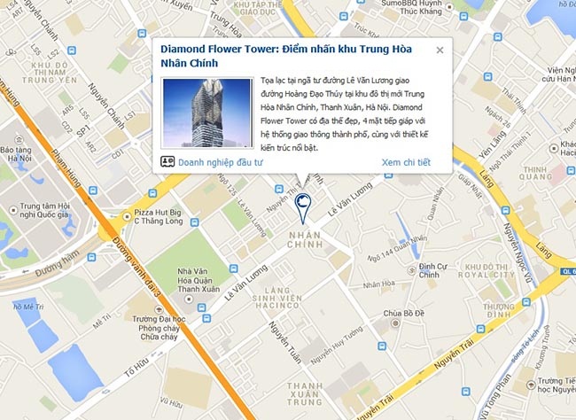 • Dự án Diamond Flower Tower nằm tại vị trí vàng của khu đô thị Trung Hòa Nhân Chính đã quy hoạch: Phía Đông Bắc giáp mặt đường Hoàng Đạo Thúy; Phía Đông Nam giáp mặt đường Lê Văn Lương