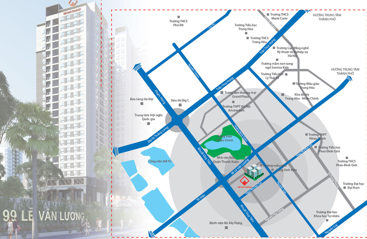 • Trong vòng bán kính 1,5km cư dân dự án dễ dàng di chuyển tới các tuyến đường huyết mạch khác như Phạm Hùng, Trần Duy Hưng, Nguyễn Trãi và nhiều trường học, bệnh viện, công viên, trung tâm thương mại lân cận: