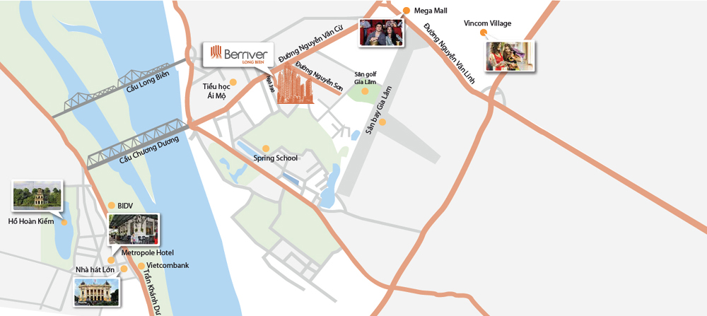 • Toạ lạc tại số 390 Nguyễn văn Cừ, quận Long Biên, Hà Nội, Berriver Long Biên chỉ cách trung tâm Hà Nội khoảng 3km, nằm trên cung đường đi vào nội thành như Nguyễn Văn Cừ, đường 5, cầu Vĩnh Tuy… và các tỉnh lân cận. Đây là yếu tố thuận lợi trong kết nối giao thông của dự án với các khu vực xung quanh, mang tới nhiều tiện ích cho cư dân. Chỉ mất vài phút để đi đến các địa điểm trong thành phố và các tiện ích lân cận, như trường học, trung tâm thương mại, cao ốc, văn phòng…