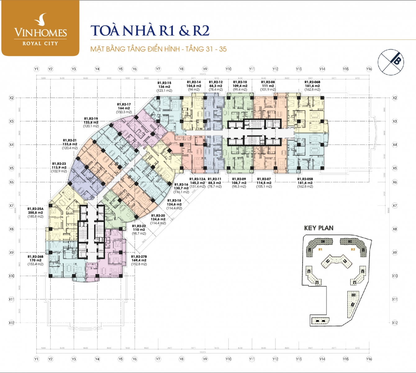 • Tổ hợp các căn hộ chung cư Royal City Nguyễn Trãi được thiết kế gồm 6 tòa từ R1 đến R6 ( R1, R1, R3, R4, R5, R6) với tổng số 4.460 căn hộ. các căn hộ có diện tích mặt bằng đa dạng (từ 88,3m2 trở lên) với 39 loại khác nhau. Mỗi căn hộ có từ 2 đến 4 phòng ngủ, được bố trí hợp lý với những không gian khác trong nhà, đáp ứng tối đa nhu cầu sinh hoạt và nghỉ ngơi của các thành viên trong gia đình.
