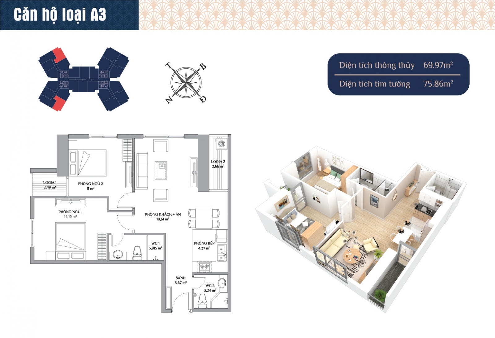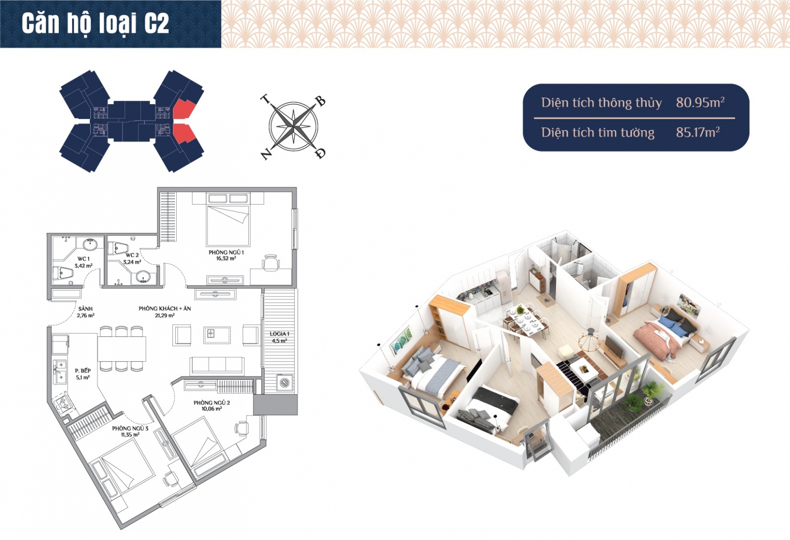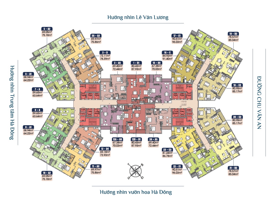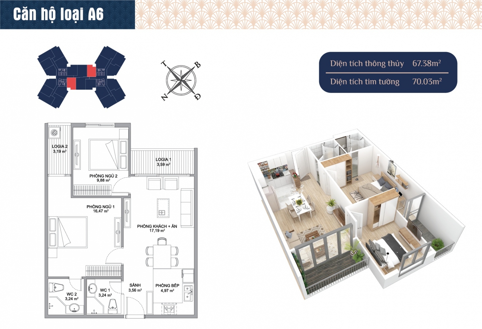 • Diện tích căn hộ từ: 58,17 m2 đến 88,19 m2