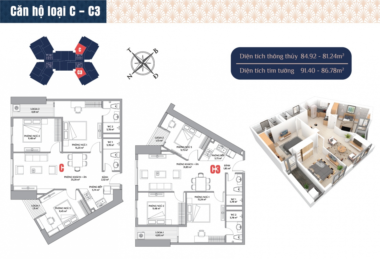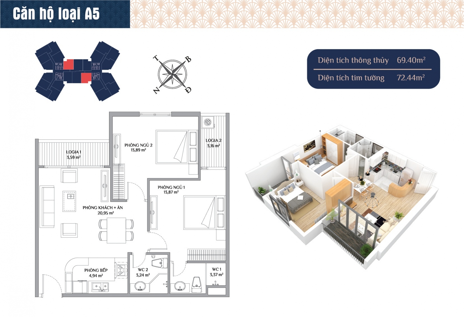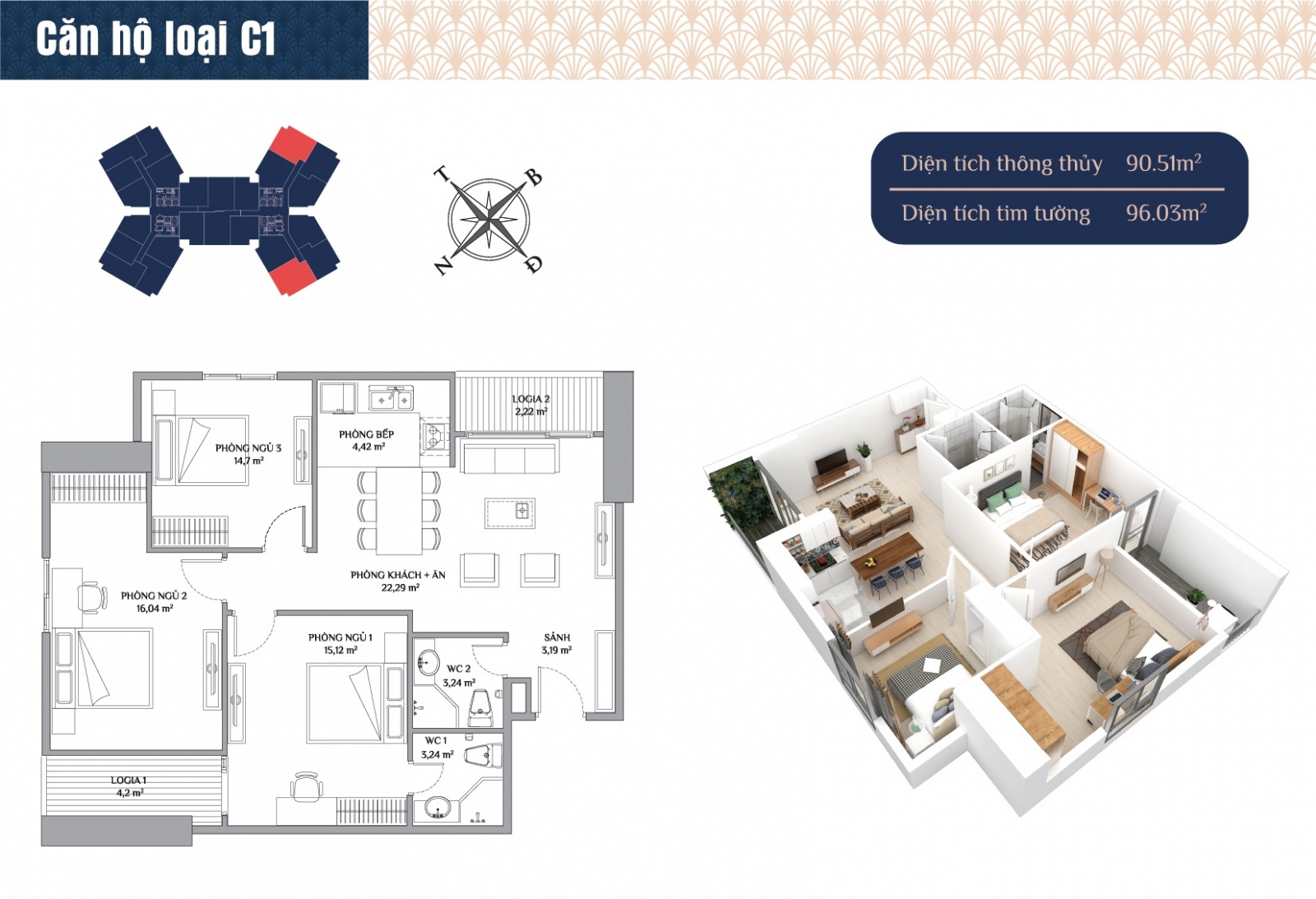 • Diện tích căn hộ từ: 58,17 m2 đến 88,19 m2
