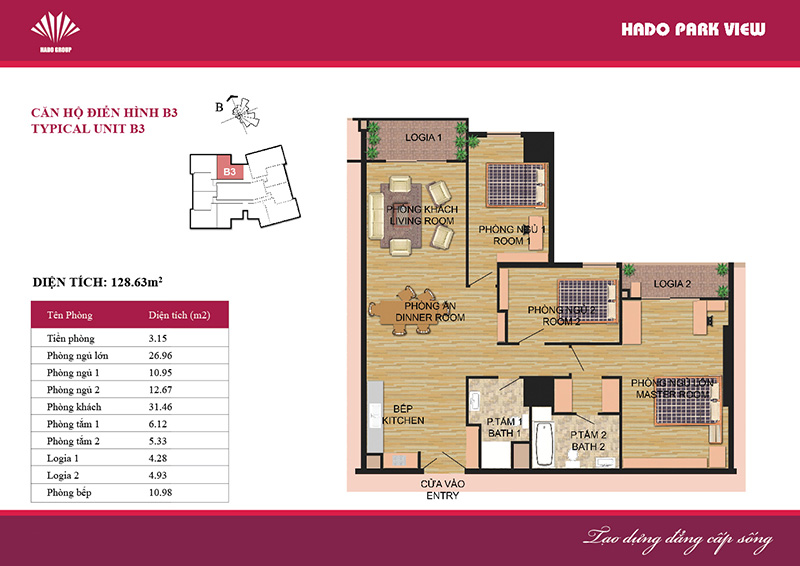 • Các loại diện tích căn hộ: 92m2 – 98m2 – 123m2 – 127m2 – 128m2 – 144 m2
