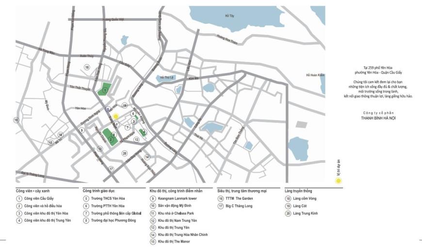 • Trường Quốc tế và các trường các cấp từ mầm non đến Đại học như: Trường quốc tế Global; trường THPT Nguyễn Siêu; các trường Tiểu học, Trung học, THPT Yên Hòa; Trường Trung học cơ sở Nam Trung Yên; trường FPT; Amsterdam; ĐH Phương Đông, Sư Phạm Hà Nội, ĐH Quốc Gia, Học viện Báo Chí và Tuyên Truyền,… Chợ và siêu thị lớn như: Chợ Yên Hòa, chợ Trung Kính, Siêu thị Fivimart, BigC Thăng Long, BigC Garden,… Khu hội nghị, vui chơi giải trí: Trung tâm Hội nghị Quốc Gia, Bảo tàng Hà Nội, Công viên Cầu Giấy, Công viên mini Khu đô thị mới Yên Hòa, Rạp chiếu phim Lotte Cinema; nhiều sân bóng đá xung quanh dự án;…