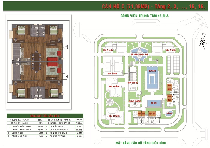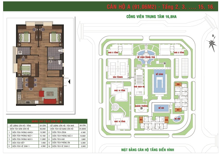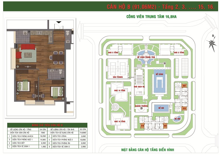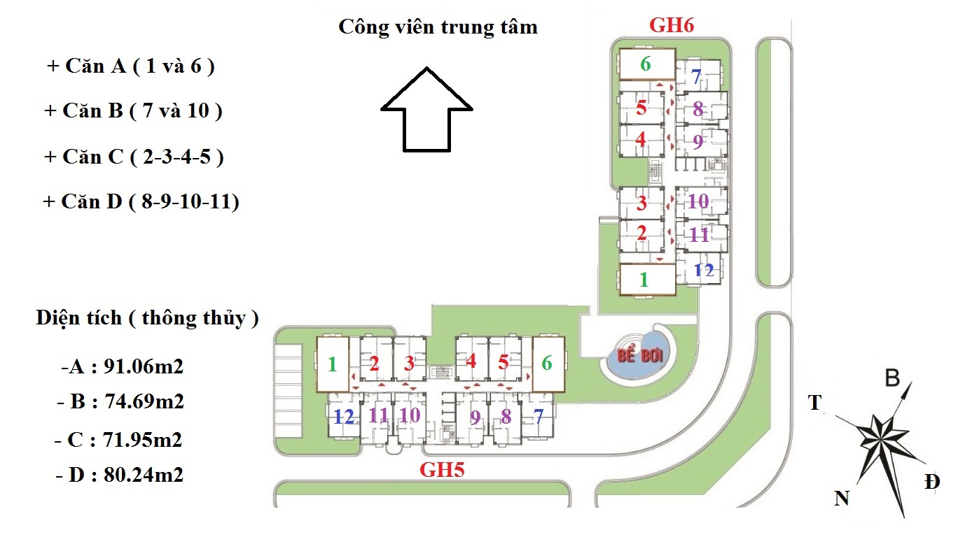• Diện tích căn hộ: từ 71.95m2, 74.69m2 và 80.24m2,91.06m2,