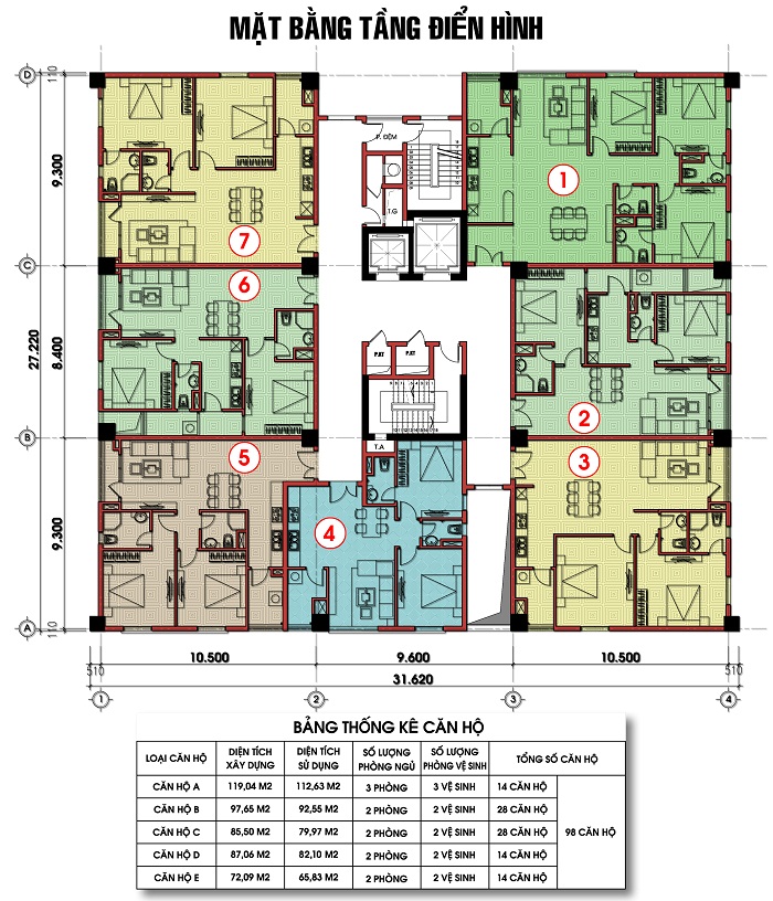 • Tổng số căn hộ: 98 căn (7 căn/1 sàn).