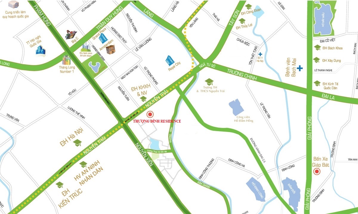 • Đây là mảnh đất không chỉ có ý nghĩa lớn về mặt phong thủy (thế đất với sự mát mẻ, cao ráo, xanh tươi, hưng thịnh) mà còn có giá đất cao nhất nhì thủ đô hiện nay. Nguyễn Trãi là tuyến đường huyết mạch kết nối phía Tây Nam thủ đô, có cơ sở hạ tầng rất phát triển, hệ thống giao thông thuận lợi ( đường vành đai, hệ thống đường sắt trên cao, hầm đường bộ). Chung cư Thượng Đình Residence còn nằm gần đường vành đai 3, tuyến đường cao tốc trên cao di chuyển đi các tỉnh khác rất nhanh chóng.