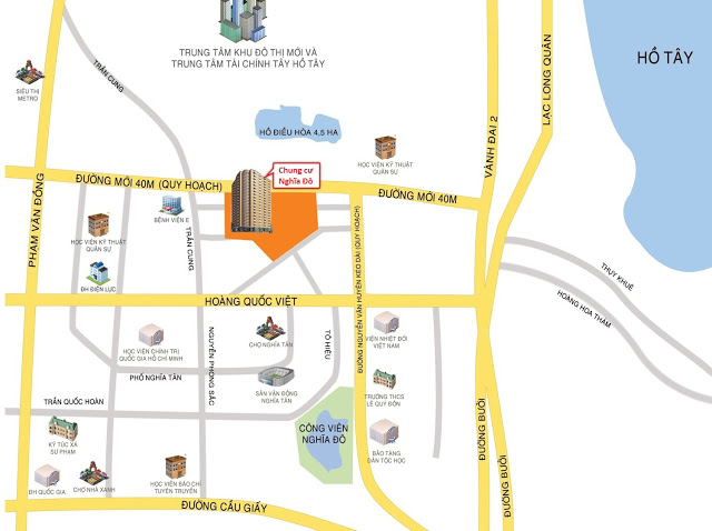 • Ngoài ra, dự án chung cư CT1A , CT1B Nghĩa Đô còn tọa lạc giáp với mặt tiền đường 40m đang thi công, đối diện với dự án là Hồ điều hòa với diện tích lên đến 4.5 ha thuộc dự án Starlake trong KĐT Tây Hồ Tây với tổng quy mô XD là 200 ha, Sống tại chung cư CT1A, CT1BNghĩa Đô bạn sẽ tận hưởng được một cuộc sống hoàn toàn tiện nghi, với đầy đủ tiện ích, từ cơ sở hạ tầng như: Công viên hồ điều hòa lên tới 4.5 ha, trường học chất lượng chuẩn quy mô 2.1 ha, tổ hợp khu thương mại & dịch vụ ...