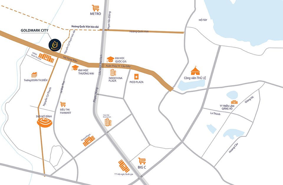 • Dự án goldmark city - 136 Hồ Tùng Mậu gắn kết chặt chẽ với các tuyến đường huyết mạch như: Lê Đức Thọ, Nguyễn Cơ Thạch, đường 32, Phạm Văn Đồng, đường Hoàng Quốc Việt kéo dài… + Gần các trường Đại học lớn như: Đại học Quốc gia, Đại học Sư phạm, Đại học Thương mại, Học viện Báo chí Tuyên truyền (cách đại học Quốc Gia 1,2 km, cách Học viện Báo chí Tuyên truyền 1,4 km). + Gần Trung tâm Hội nghị Quốc gia, bến xe Mỹ Đình, sân vận động Mỹ Đình (cách bến xe Mỹ Đình 2,5 km, cách sân vận động Mỹ Đình 3 km). Gần bệnh viện 198 (cách bệnh viện 19 – 8 là 2km).