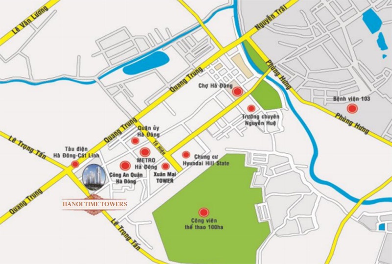 • Chung cư Hà Nội Time Towers nằm trên mặt đường Lê Trọng Tấn kéo dài, ngay gần điểm giao cắt với đường Quang Trung ( Quốc lộ 6), nơi tuyến đường sắt trên cao Cát Linh - Hà Đông đi vào trung tâm thành phố Hà Nội chỉ 10p đi tàu.