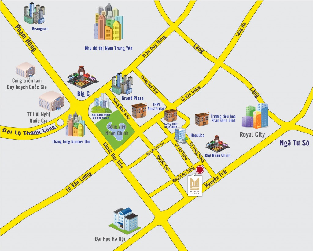 • Tọa lạc số 62 Nguyễn Huy Tưởng trung tâm quận Thanh Xuân, Chung cư Mỹ Sơn Tower thuộc khu dân cư sầm uất bậc nhất của thành phố Hà Nội với hệ thống cơ sở hạ tầng hiện đại, các tiện ích công cộng như giáo dục, y tế, thể thao, văn hóa…. đồng bộ và chất lượng cao. Tòa nhà kết nôi giao thông thuận lợi với các trục giao thông chính như Lê Văn Lương, Nguyễn Trãi, Láng, Khuất Duy Tiến…..nhưng vẫn đảm bảo được không gian sống yên tĩnh và thoải mái.