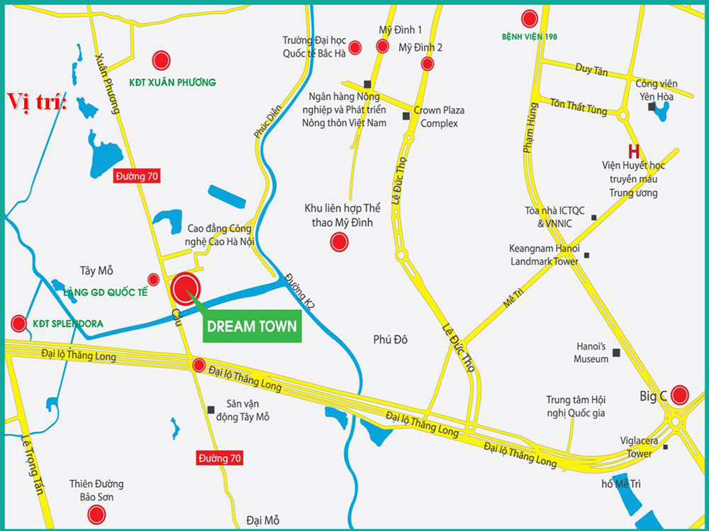 • Dự án Chung cư Dream Town nằm trên quốc lộ 70, xã Tây Mỗ, Từ Liêm, Hà Nội. Từ dự án, chỉ mất chưa tới 10 phút để tới Trung tâm hội nghị quốc gia Mỹ Đình, BigC, Grand Plaza, bệnh viện 198… Nằm trong chuối các khu đô thị mới: KĐT Xuân Phương, KĐT Splendora, Dự án nhà ở Văn phòng Quốc hội, KĐT Vân Canh, KĐT Mỹ Đình