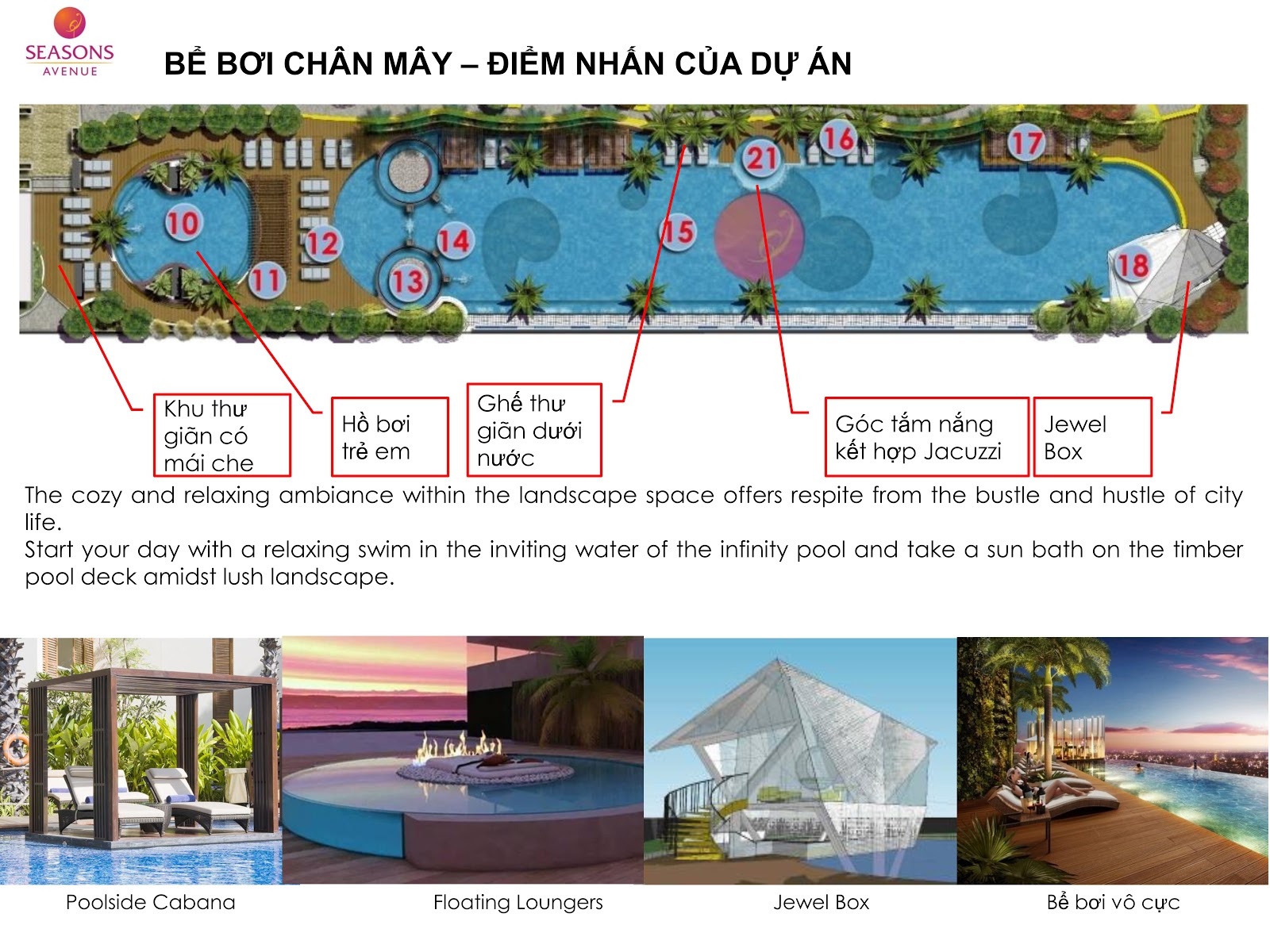 • Tiện ích nổi trội của Dự án Seasons Avenuses Mỗ Lao, bao gồm: Khu bể bơi ngoài trời; Vườn xanh thẳng đứng; Bể bơi tràn bờ trên tầng 5 (bể bơi chân không); Hệ thống bậc thang độc đáo phục vụ nhu cầu tập thể dục của cư dân: Calorine burning steps;