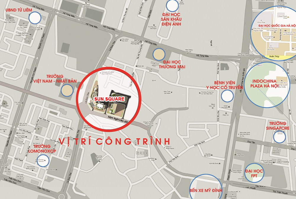 • Chung cư Sun Square được xây dựng trên khu đất rộng khoảng 15.500m2 tại xã Mỹ Đình huyện từ Liêm, Hà Nội. Dự án có một vị trí chiến lược trong nút giao thông đi đường vành đai 3, đường 32 (Cầu Giấy – Nhổn), Hoàng Quốc Việt – Láng Hòa Lạc. Đây chính là cửa ngõ của Khu đô thị mới đang phát triển của Hà Nội. Đặc biệt, dự án nằm trên đường Lê Đức Thọ, đường dẫn vào Sân vận động Quốc gia Mỹ Đình hiện đại nhất Việt Nam. Hạ tầng kiến trúc xung quanh dự án tương đối hoàn chỉnh với nhiều công trình vui chơi giải trí, giáo dục, y tế và các trung tâm thương mại lớn …
