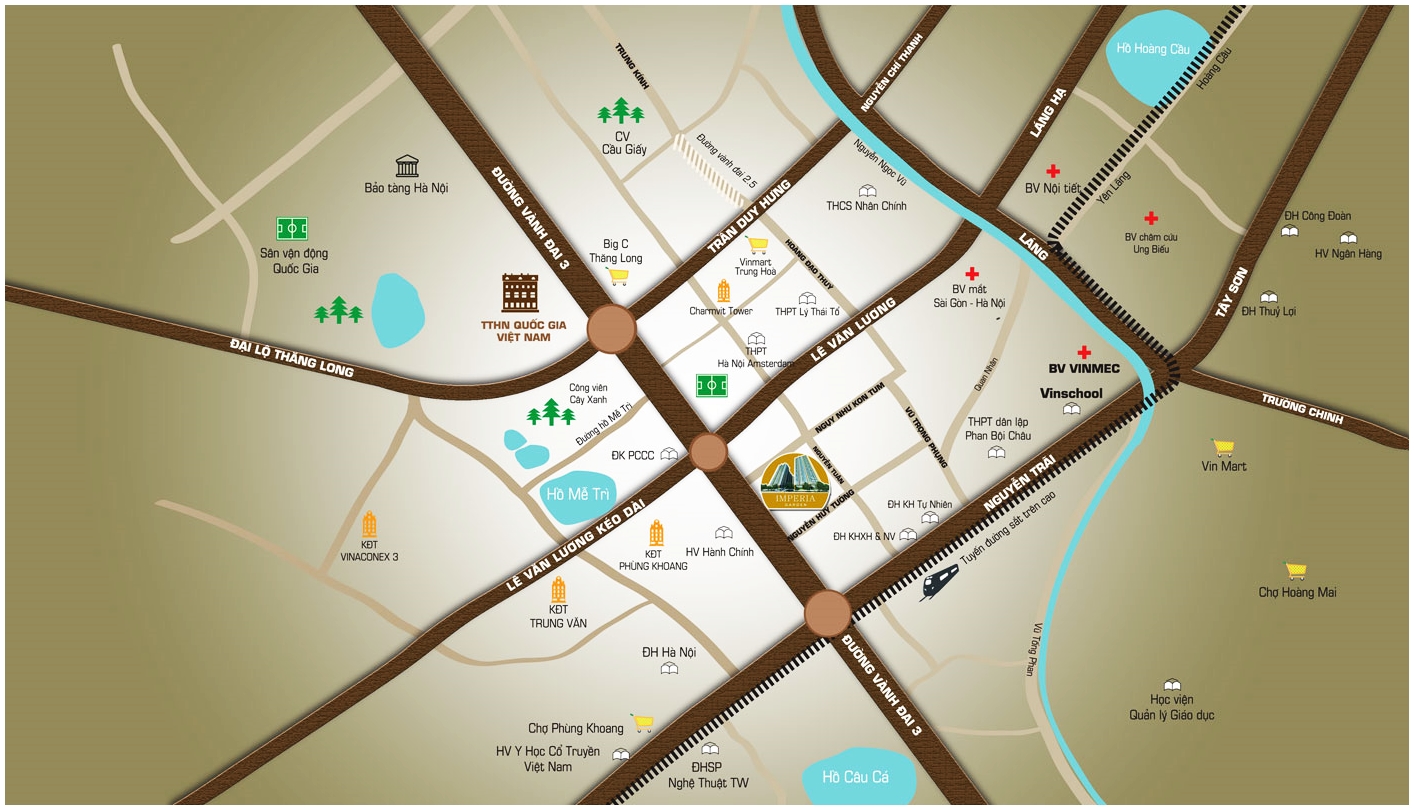 • Từ khu dự án, chỉ phải đi 500m là đến trường THPT Amsterdam nổi tiếng, 1km là tới trường đại học KHXH Nhân Văn, 1km là tới Big C, 1,5 km là đến khu trung khu đô thị Royal City, 1 km là tới Keangnam. Ngoài ra, Bến Xe Mỹ Đình, Sân vận động quốc gia Mỹ Đình – nơi thường xuyên diễn ra các sự kiện thể thao, chung cư cao cấp Grand Plaza, Chung cư 88 Láng Hạ, trường Học viện An Ninh, học viện Quản Lý Giáo Dục … cũng rất gần ngay khu dự án