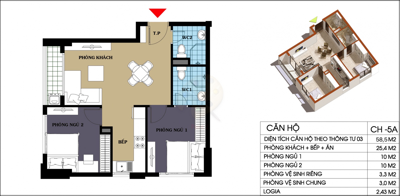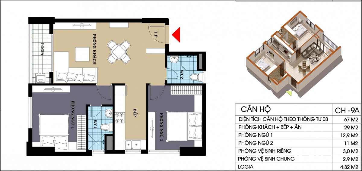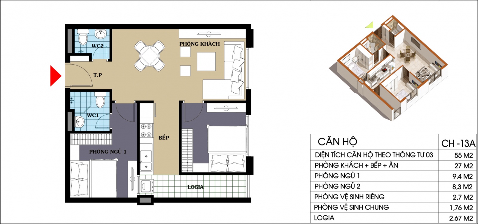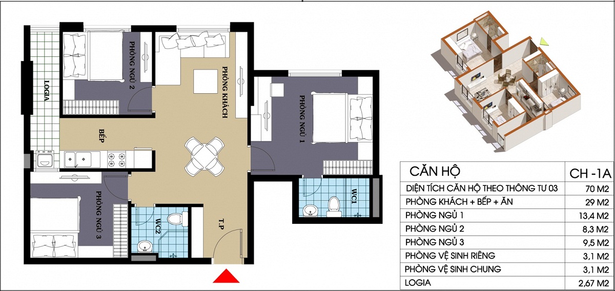 • Diện tích căn hộ: Từ 55 m2 đến 70 m2.