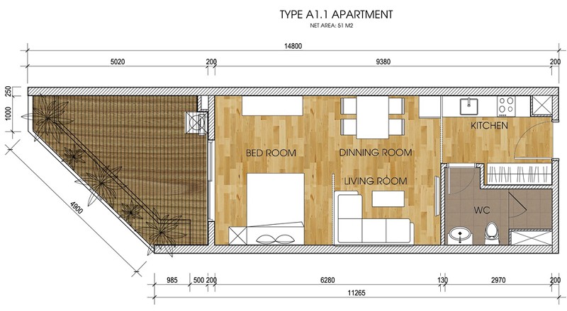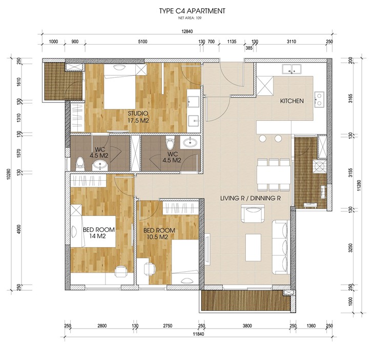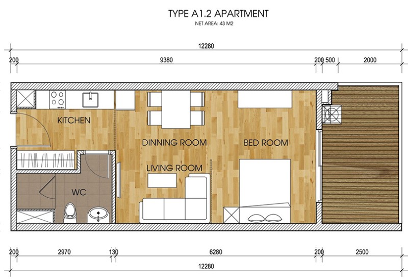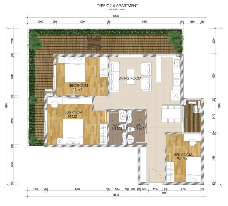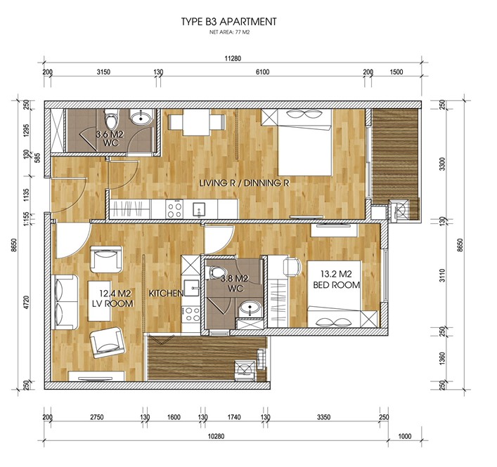 • Diện tích căn hộ: từ 37 m2 đến 126 m2