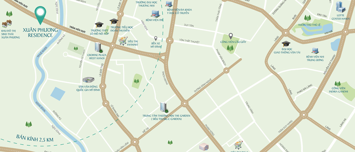 • Dự án chung cư Xuân Phương Residence tọa lạc tại khu vực mới phát triển của quận Nam Từ Liêm, đang được TP Hà Nội đầu tư mở rộng mạnh mẽ. Dự án gần tuyến đường Trần Hữu Dực nên việc di chuyển từ dự án đến các khu trung tâm Hà Nội rất thuận lợi.