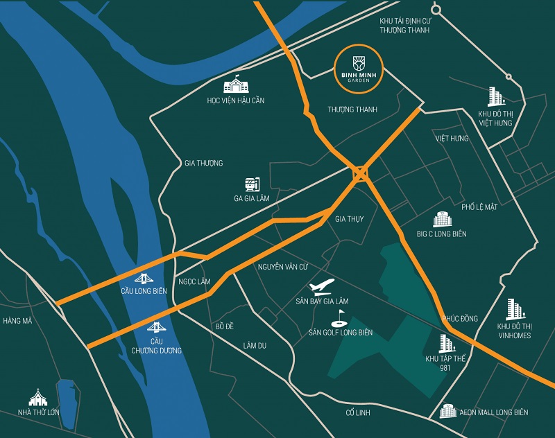• Bình Minh Garden nằm tại Số 93 Đức Giang, P. Thượng Thanh, Q. Long Biên, TP Hà Nội. Với hệ thống hạ tầng giao thông đồng bộ, mật độ cư dân thấp cũng như diện tích các công trình cây xanh hồ nước lớn đã được đưa vào phục vụ người dân.