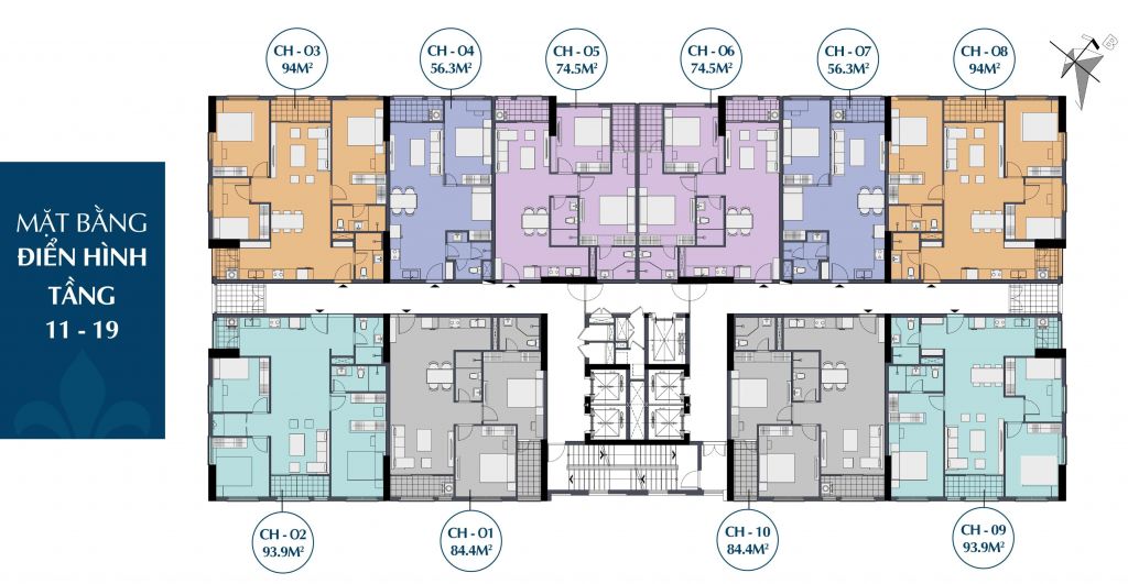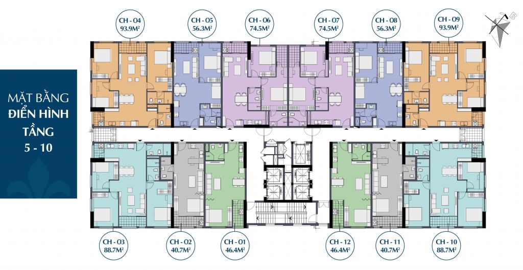 • Diện tích căn hộ: 40,7m2 – 94m2.