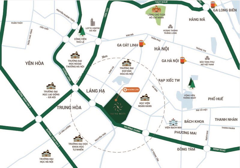 • Tọa lạc tại số 90 đường Láng, TNR The Nosta trở thành dự án hạng sang hiếm hoi nằm trên quỹ đất vàng của Thủ đô - nơi giao điểm của nhiều trục đường chính trong nội thành. Lợi thế khiến TNR The Nosta gây chú ý không chỉ bởi vị trí đắc địa mà đây còn là dòng sản phẩm hạng sang cùng số lượng căn hộ giới hạn chỉ 480 căn.