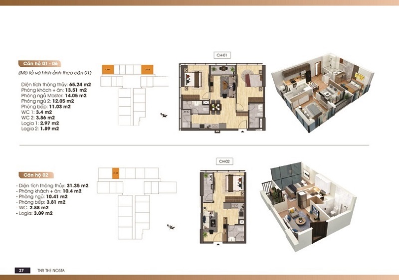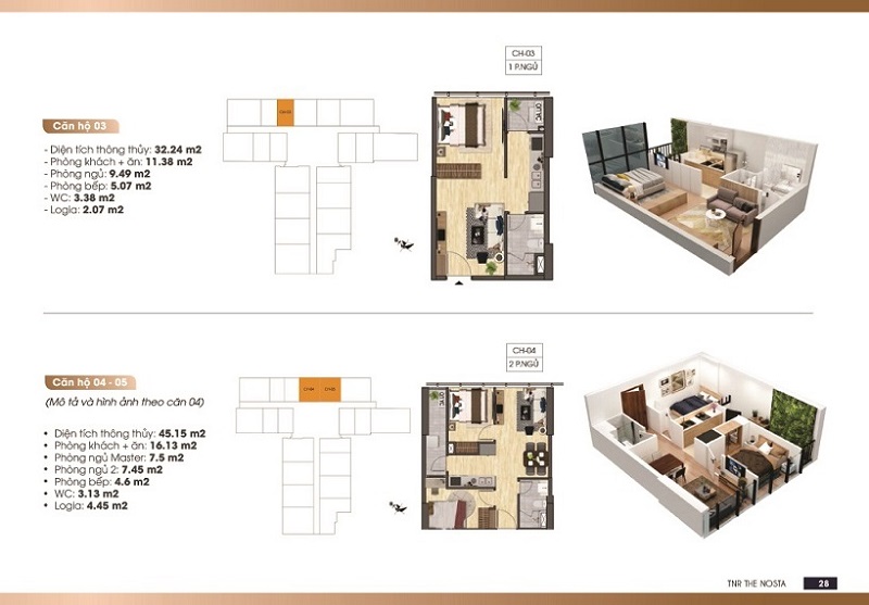 • Các căn hộ tại TNR The Nosta được thiết kế với nhiều loại diện tích khác nhau đáp ứng đầy đủ nhu cầu sử dụng của quý khách hàng. Mỗi căn hộ đều được bố trí không gian phòng hợp lý giúp gia chủ có cảm giác thoải mái, và ấm cúng.