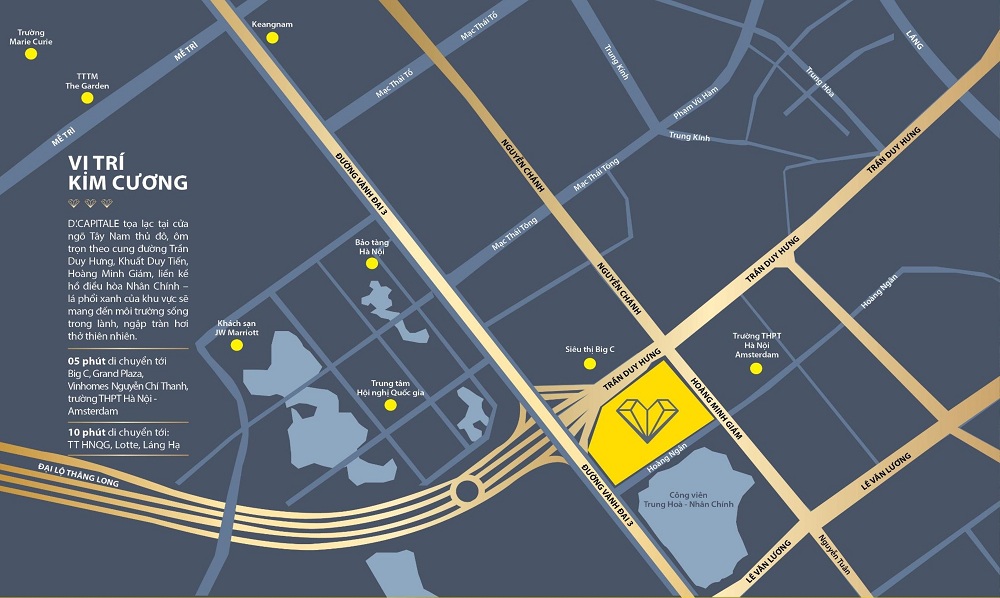 • Vinhomes D’ Capitale Trần Duy Hưng sẽ là điểm dừng chân cuối cùng của các nhà đầu tư thông thái, vì thiết kế hoàn hảo, tiện ích đồng bộ và giá trị cốt lõi vượt thời gian. Từ Vinhomes D’ Capitale Trần Duy Hưng, cư dân chỉ mất: 5 phút để tới trung tâm Hội nghị Quốc gia, cách 1Km; mất 15 phút để tới trung tâm thủ đô, Ga Hà Nội, Bệnh viện Bạch Mai, Hồ Hoàn Kiếm; mất 10 phút để tới sân vận động Mỹ Đình, cách 1.5Km; Chỉ 25 phút di chuyển tới sân bay quốc tế Nội Bài. Dễ dàng di chuyển tới hệ thống trường học trong các khu vực lân cận như: Lương Thế Vinh, Amsterdan, Đại học Bưu chính viễn thông, Đại học Ngoại ngữ,…cùng nhiều trường từ cấp mầm non tới đại học.