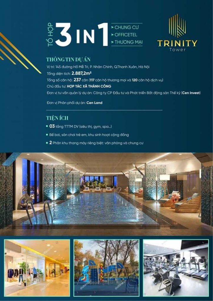 • Trinity Tower hồ Mễ Trì được thiết kế và xây dựng theo tiêu chuẩn khách sạn 5* quốc tế, tầng TTTM , bể bơi 4 mua trong nhà và ngoài trời, hệ thống các phòng tập Gym , Yoga, Fitness, Siêu thị, Shop thời trang mang thương hiệu quốc tế, ẩm thực Á – Âu… . Dự án hứa hẹn sẽ đem lại cuộc sống trải nghiệm tuyệt vời cho cư dân. Lựa chọn căn hộ Trinity Tower, bạn không chỉ có một căn nhà đáng mơ ước giữa trung tâm, mà còn chính thức bước chân vào cộng đồng tinh anh tại thủ đô Hà Nội.