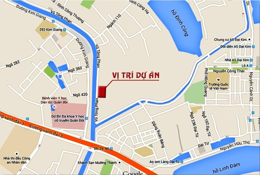 • Khu nhà ở xã hội được xây dựng tại Đại Kim, quận Hoàng Mai cách Ngã Tư Sở chỉ 4 km với 10 phút đi xe là tới Royal City, nằm gần khu Đô thị Linh Đàm, gần đường Giải phóng, khu đô thị Đại Kim