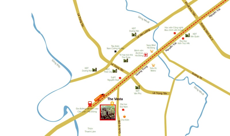 • Tọa lạc cạnh trung tâm Quận Hà Đông, nằm tại điểm đầu của tuyến đường sắt đô thị trên cao Hà Đông – Cát Linh, The Vesta là nơi có kết nối giao thông thuận tiện: phía Bắc giáp đường nhựa rộng 18m; phía Đông giáp trục quốc lộ 21B; phía Tây giáp khu vực đất dân cư; phía Nam giáp đường dân sinh; liền kề khu dân cư đông đúc với nhiều dịch vụ tiện ích có sẵn như: Chợ Xốm, siêu thị Metro Hà Đông, siêu thị Sapo, bệnh viện đa khoa Hà Đông, công viên Hà Đông…