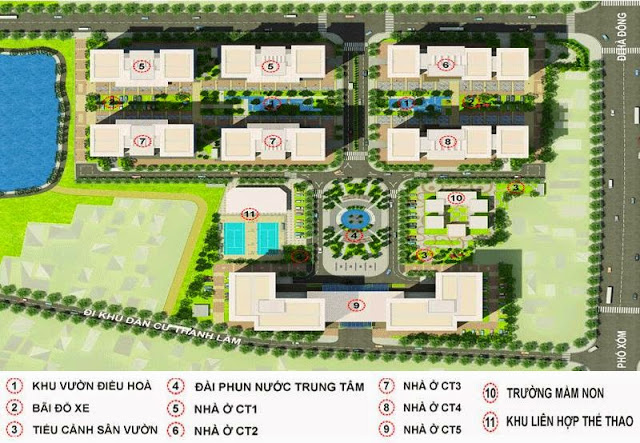 • Các khuôn viên cây xanh, vườn hoa được thiết kế xen kẽ, tạo không gian nghỉ ngơi, thư giãn và các tiện ích để người dân có thể luyện tập thể thao, đi dạo … đáp ứng yêu cầu thông gió, chống ồn, điều hoà không khí và ánh sáng, cải thiện tốt môi trường vi khí hậu để đảm bảo nâng cao sức khoẻ cho khu dân cư. Đài phun nước, hồ điều hoà được thiết kế ở các vị trí trung tâm, tạo cảnh quan sạch đẹp và góp phần điều hoà không khí.