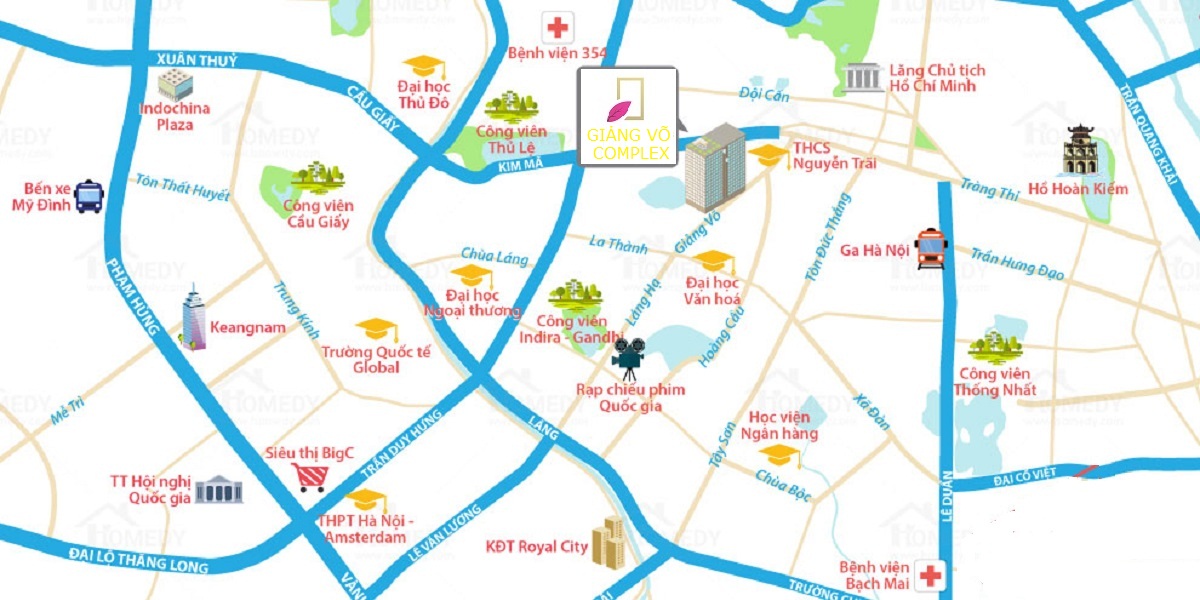 • Nằm trên những trục đường chính của Hà Nội nối liền tới các quận huyện vào trung tâm thành phố Chung cư Giảng Võ Complex là cầu nối gắn kết đến các vị trí trung tâm của thủ đô. Từ đây cư dân nơi đây rất dễ dàng di chuyển ra các địa điểm:
