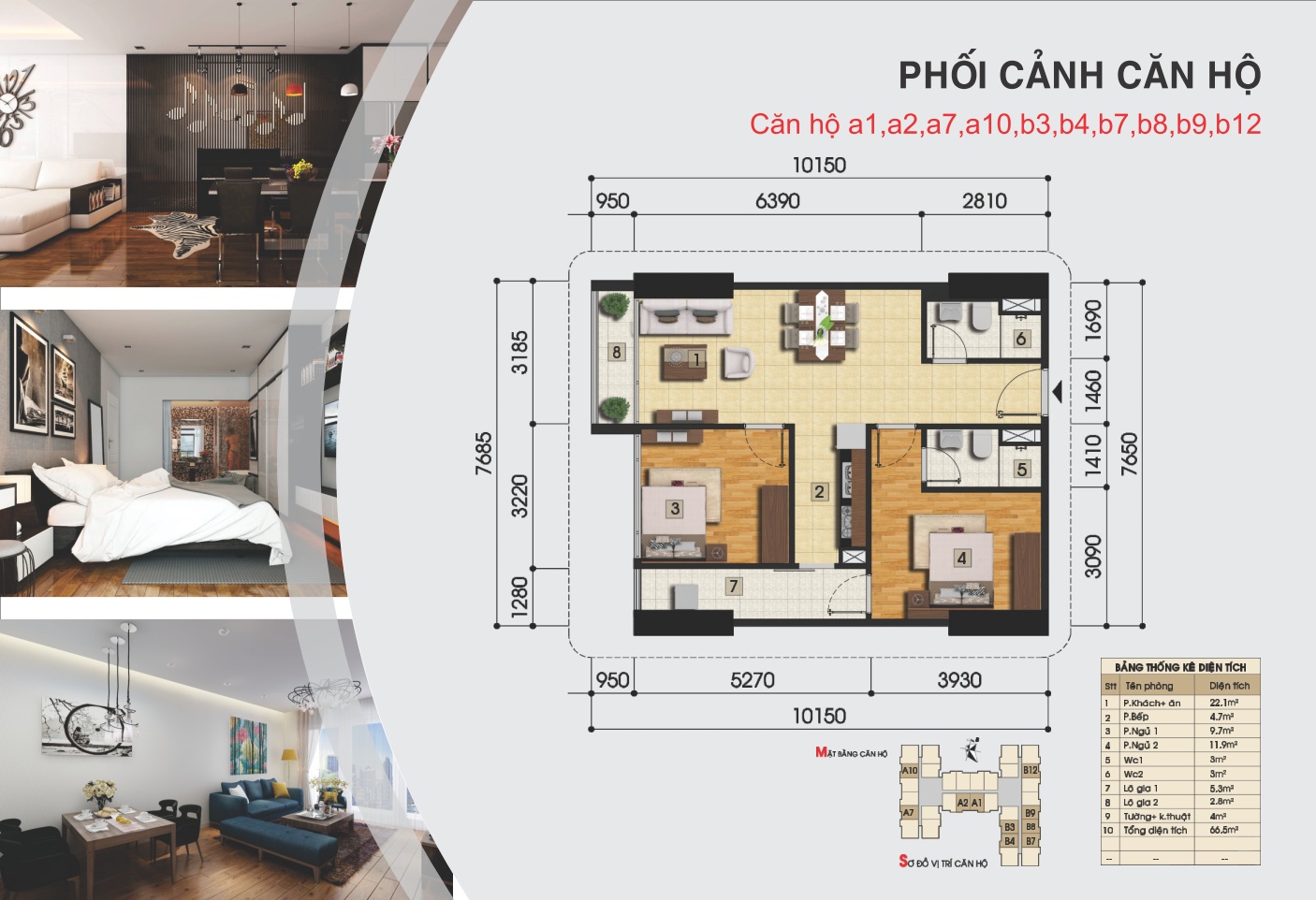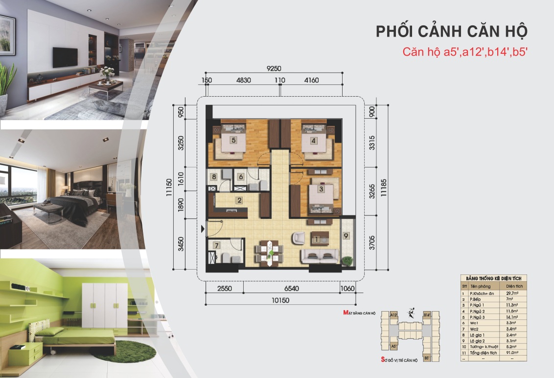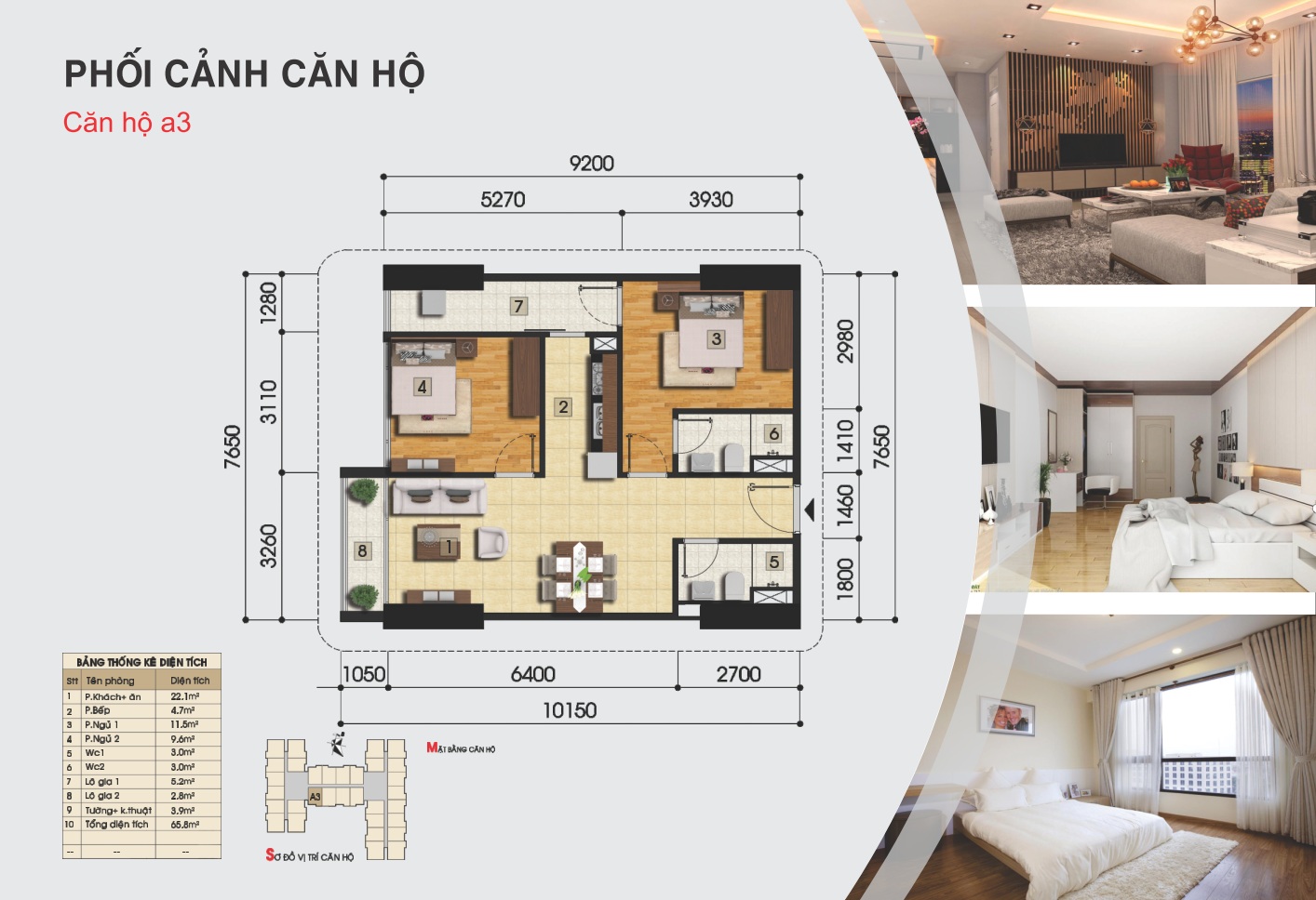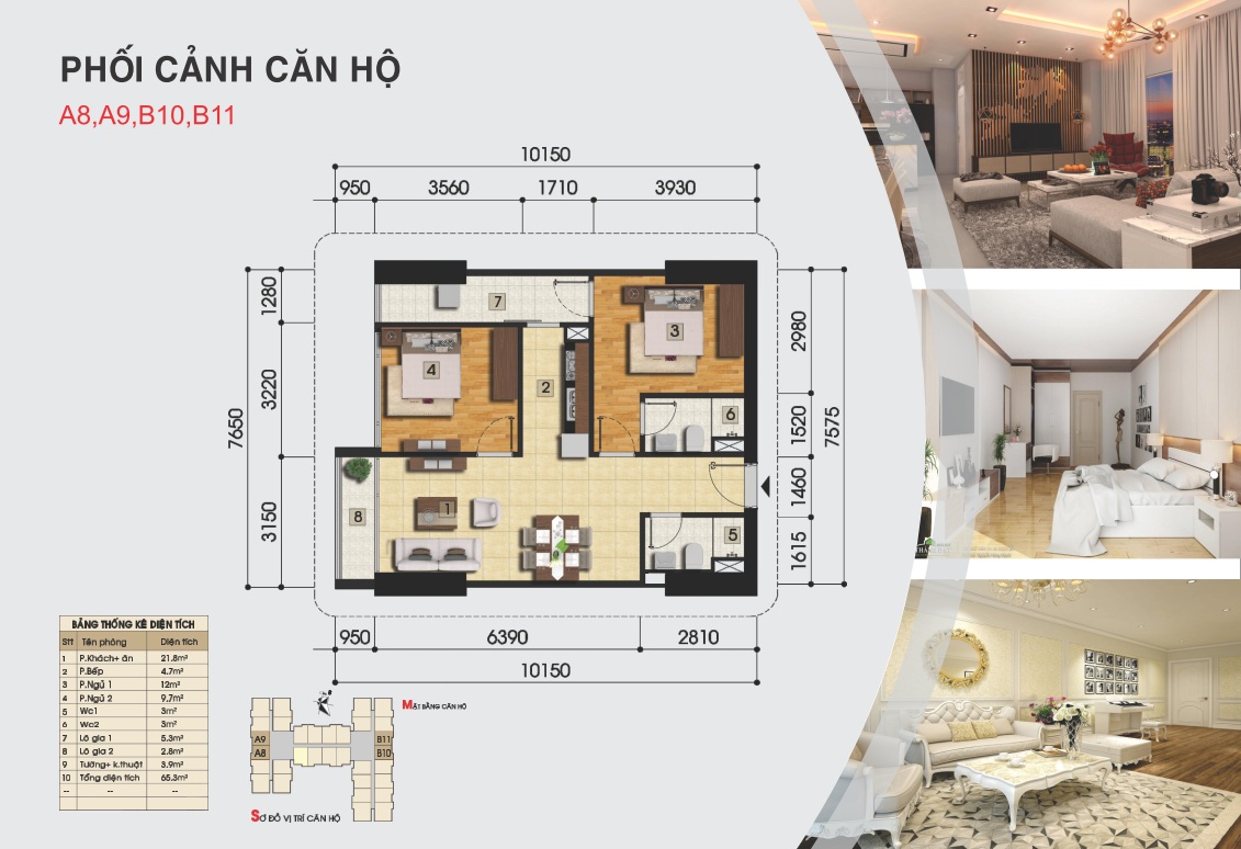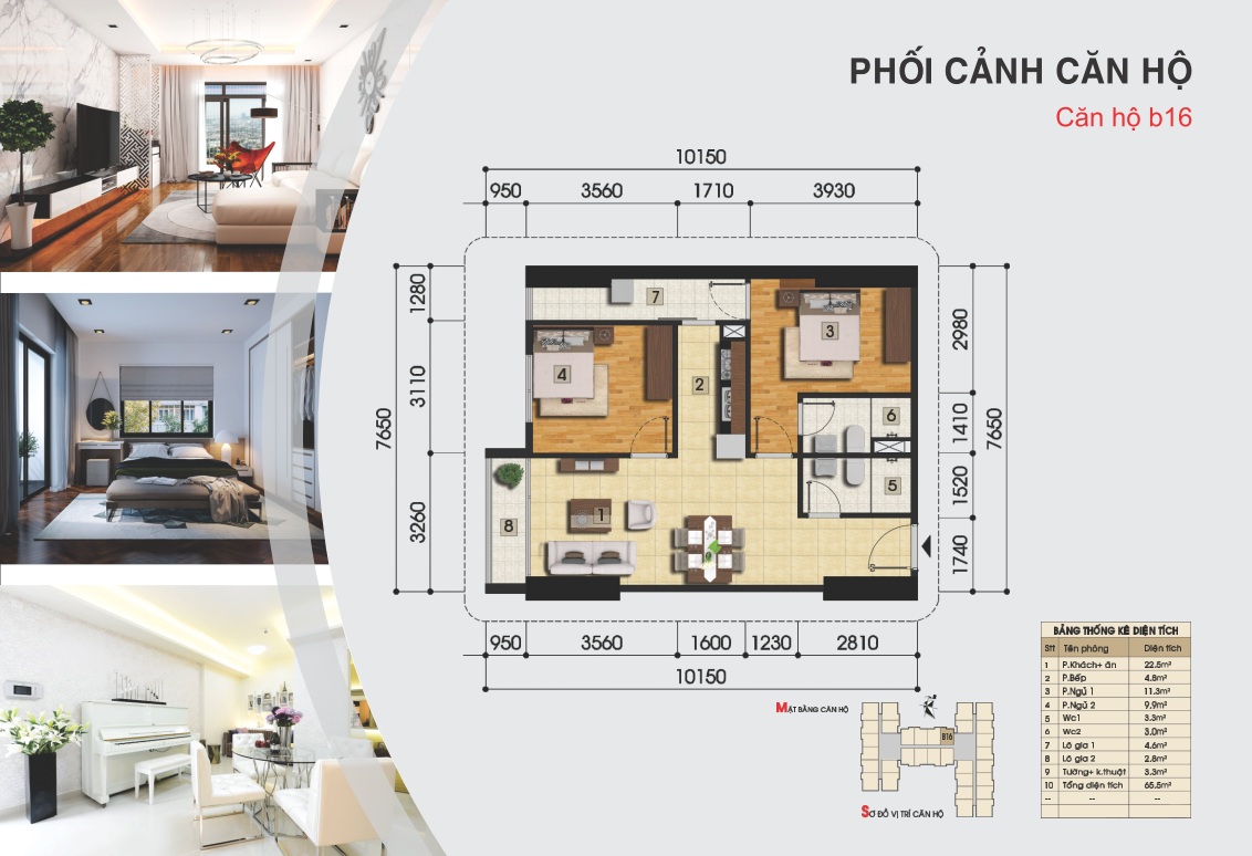 • Diện tích căn hộ: từ 65,5m2 đến 91,3m2.