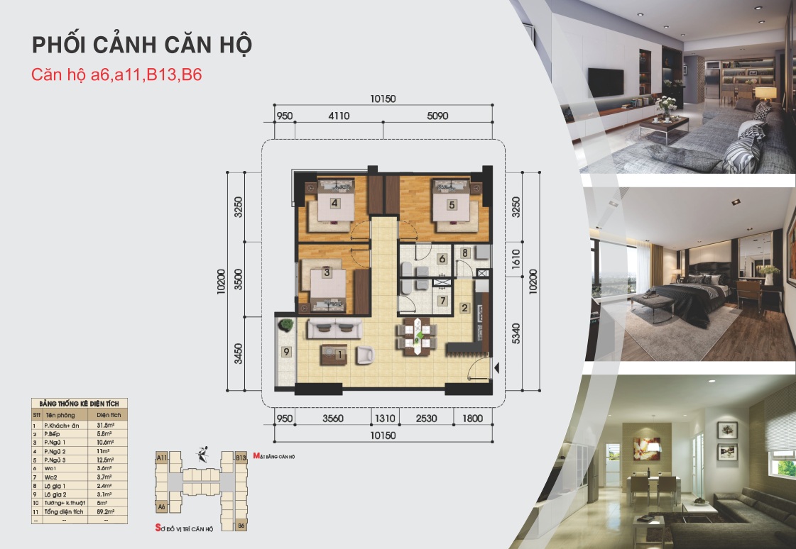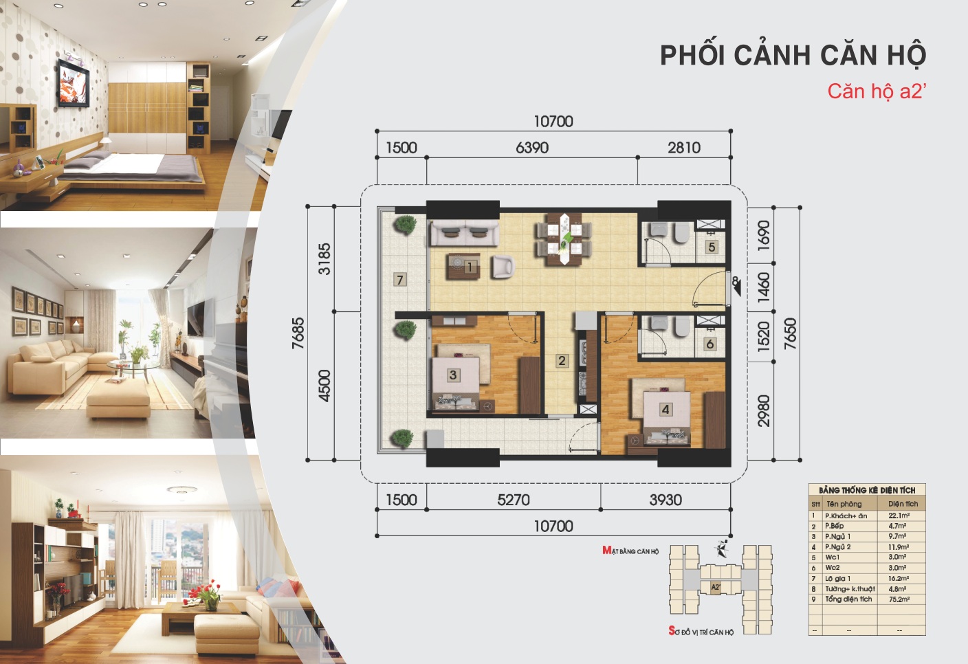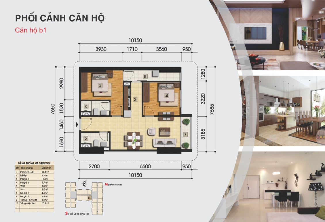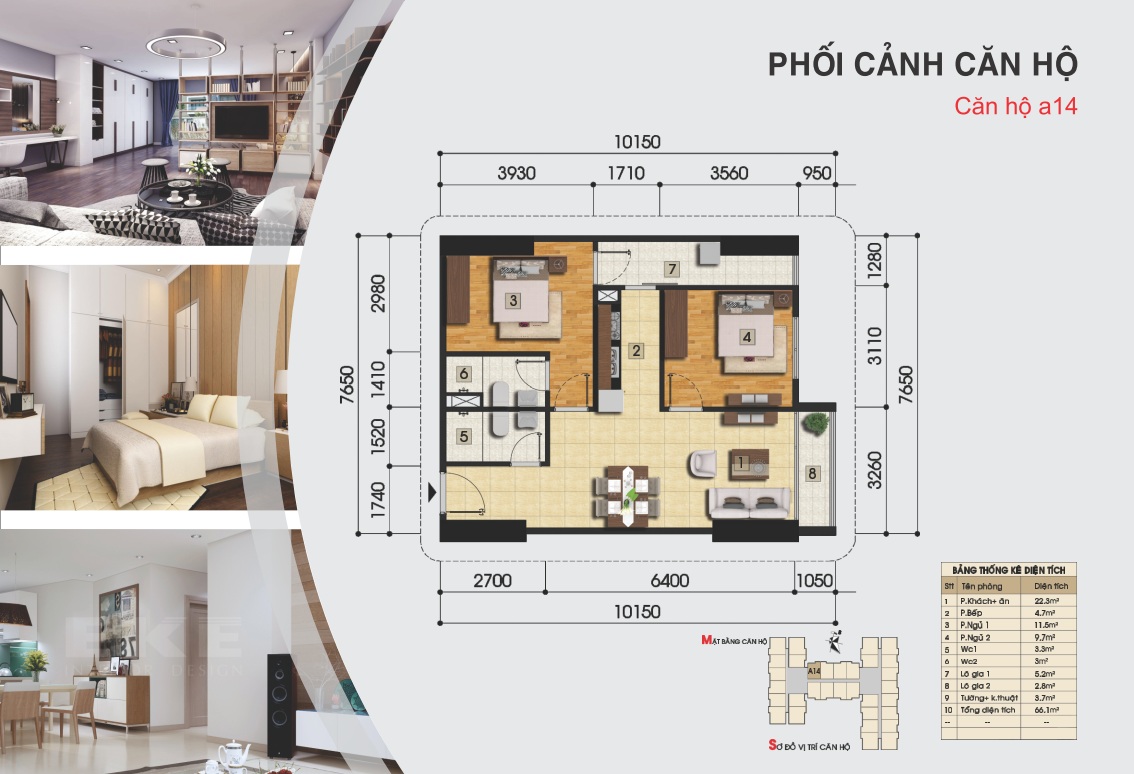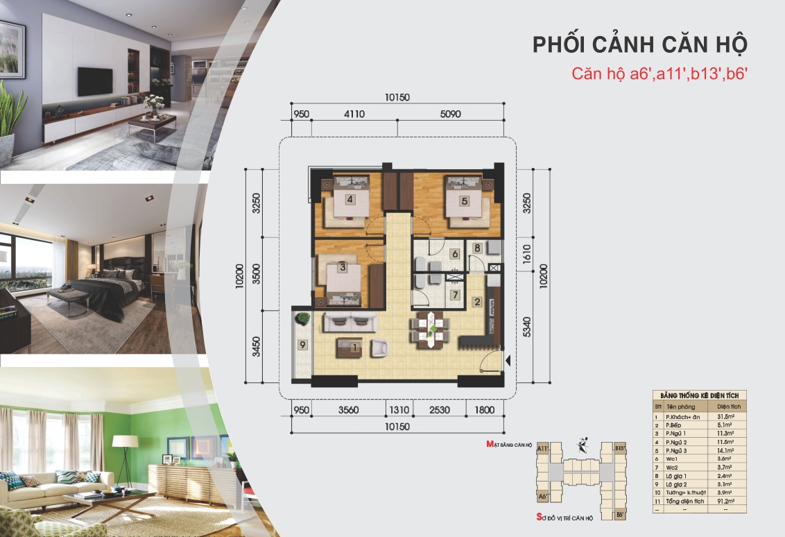 • Diện tích căn hộ: từ 65,5m2 đến 91,3m2.