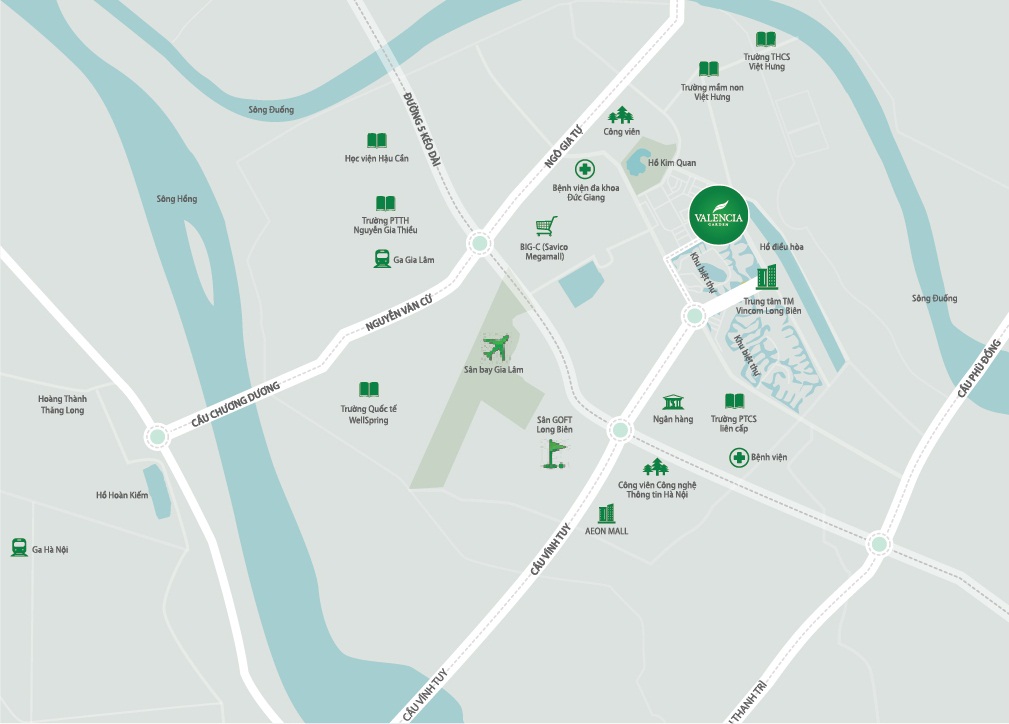 • Tọa lạc tại khu đất CT-19B khu đô thị Việt Hưng, Long Biên, Hà Nội - là một trong những khu vực kinh tế trọng điểm của Hà Nội, giao thông thuận lợi với các tuyến đường cao tốc, quốc lộ chạy xung quanh, dễ dàng di chuyển tới sân bay Nội Bài, cảng Hải Phòng. Valencia Garden nằm ngay cạnh khu đô thị đẳng cấp Vinhome Riverside với đầy đủ cơ sở hạ tầng giao thông, tiện ích, công viên Việt Hưng, các trung tâm thương mại BigC Long Biên, Vincom Long Biên…