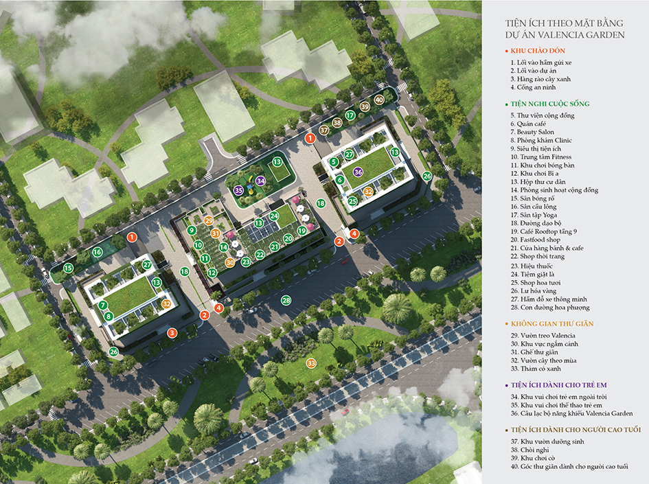 • Valencia Garden mang đến cho bạn không gian sống khép kín, an toàn với 40 tiện ích nội khu như vườn cây, khu thể thao phức hợp, đường dạo bộ, khu vui chơi trẻ em, câu lạc bộ sức khỏe, câu lạc bộ năng khiếu, hiệu thuốc, siêu thị tiện ích, phòng khám, vườn treo, cafe trên cao.... Bạn sẽ yên tâm hưởng thụ cuộc sống phục vụ đầy đủ nhu cầu thiết yếu của gia đình ngay trong khu đô thị.