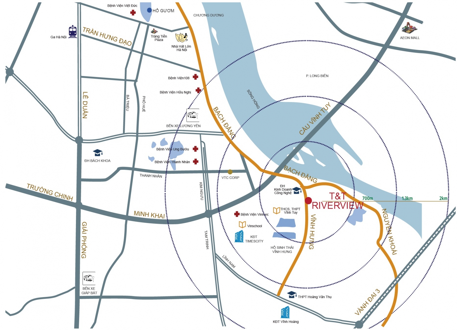 • Chung cư T&T Vĩnh Hưng tọa lạc phía Nam TP, cách cầu Vĩnh Tuy 500m, từ đây có thể kết nối nhanh chóng và dễ dàng tới tất cả các khu vực trong thành phố như đường Nguyễn Khoái đi Trung Tâm TP, tới các điểm vui chơi như Hồ Hoàn Kiếm, Phố Cổ, Nhà Hát Lớn, Tràng Tiền Plaza.. chỉ 4km. Cách trục đường là xương sống thành phố, Vành Đai 3 ( 3km ). Riêng cầu Vĩnh Tuy là cửa ngõ Huyết mạch, nối nội thành Hà Nội với quận Long Biên với các TTTM mua sắm nổi tiếng như AEON Long Biên, Vinhomes Riverside (cư dân T&T thỏa sức vui chơi, mua sắm khi sang bên kia cầu).
