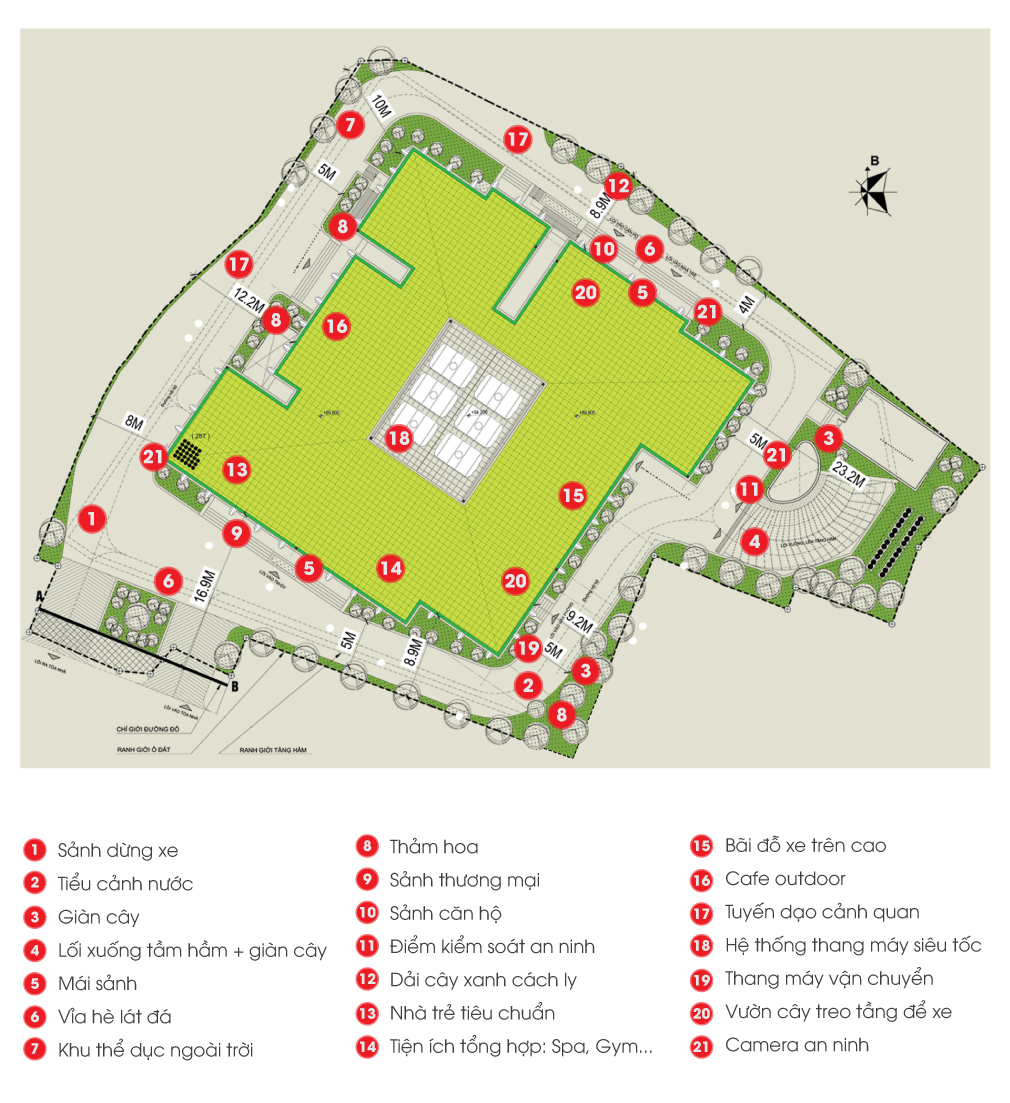 • Mật độ xây dựng: khối đế khoảng 34,6%;