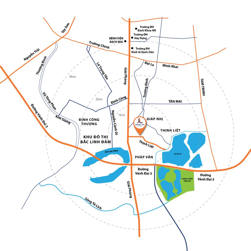 • Dự án Hồng Hà Tower cách bên xe Nước Ngầm, đường vành đai 3 khoảng 500m; Cách đường Giải Phóng 200m; Cách bến xe Giáp Bát 200m; Cách bệnh viện Bạch Mai 3km; Gần các trường mầm non, tiểu học, trung học cơ sở, các trường đại học lớn như: Bách Khoa, Kinh Tế Quốc Dân, Xây Dựng… Công viên Yên Sở quy mô lớn nhất Đông Nam Á được ví như lá phổi xanh của Hà Nội.