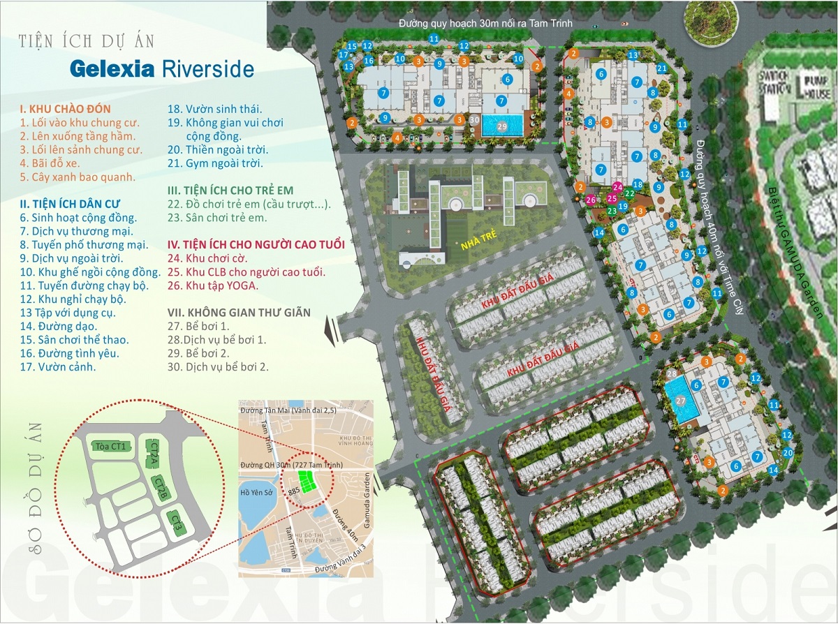 • Chung cư Gelexia Riverside nằm trong quy hoạch dự án xây dựng khu nhà ở tại quận Hoàng Mai, địa điểm chung cư 885 Tam Trinh tại ô quy hoạch C11/ODK2, phường Yên Sở - quận Hoàng Mai – Hà Nội có phạm vi nghiên cứu khoảng 35.010m2, trong đó:
