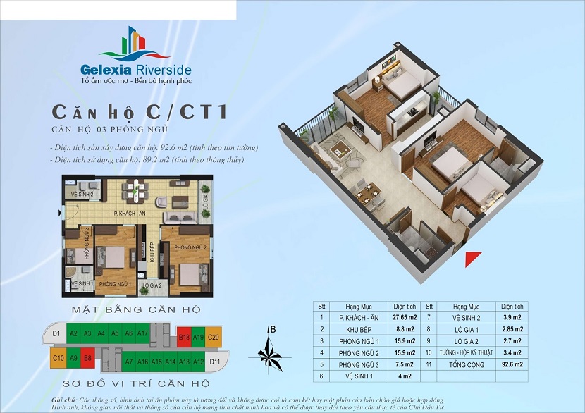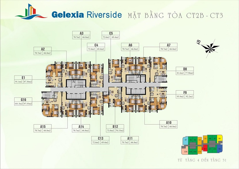 • Các căn hộ có diện tích chủ yếu từ: 65,8m2 đến 89,7m2