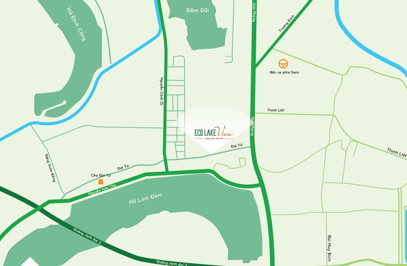 • Từ vị trí Eco Lake View ta sẽ dễ dàng đi vào trung tâm thành phố mà không sợ bị tắc đường thông qua tuyến đường Giải Phóng – Lê Duẩn. Hoặc di chuyển đến tuyến đường vành đai 3 rồi di chuyển mọi nơi trong thành phố. Dự án Eco Lake View gần với các khu đô thị đã được đồng bộ như: KĐT mới Đại Kim, KĐT Linh Đàm, KĐT Pháp Vân Tứ Hiệp, KĐT Ao Sào…
