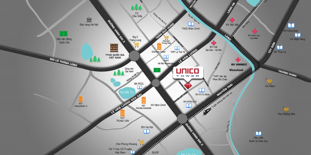 • Dự án Unico Tower nằm tiếp giáp giữa các con đường lớn của HN như: Đường Nguyễn Trãi, đường Lê Văn Lương, Đường Phạm Hùng, Khuất Duy Tiến … Chung cư Unico Tower nằm gần các trường Đại Học lớn như: Trường Đại Học Quốc Gia, Đại Học An Ninh, Đại Học Hà Nội, Đại Học Kiến Trúc, Đại Học SP Nghệ Thuật TW…